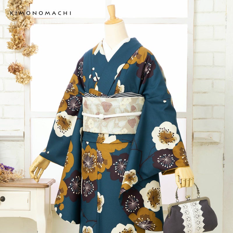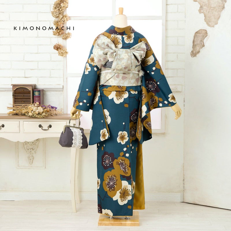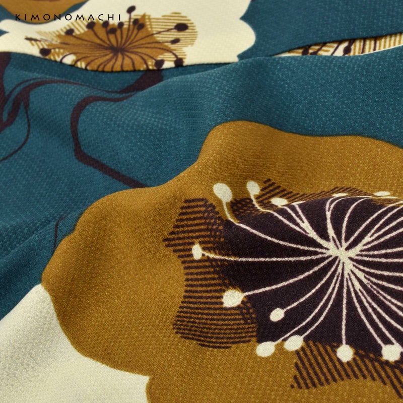 細かな地模様のある生地です。落ち着いたテールグリーンの地に、黄土色、生成り色、セピア色の大胆な印象にデザインされた梅の花。花の中心は、ぼかしではなく線を重ねた表現となっています。直線的でエッジのある梅の花の形に、丸く古典的な雰囲気の枝やつぼみが懐かしさを添える、モダンでありながらレトロな魅力のある着物です