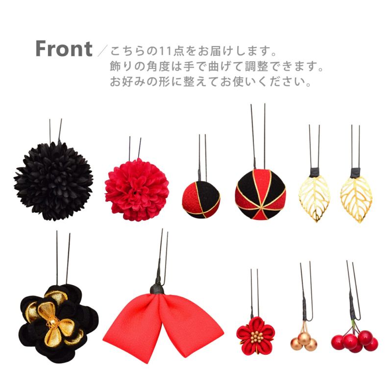 赤黒:くっきりとした赤のリボン飾り。つまみのお花・大は黒にゴールド、花芯もゴールド。つまみの小は深い赤にブロンズの花芯。ポンポンマムのような造花は、大が黒色、中が暗赤色の各1点。玉飾り大小は黒に明るい赤、深い赤を組み合わせ、金糸の縁取りがあります。ゴールドの透かしの葉が2点。ビーズ飾りはつやのある濃赤色とブロンズを組み合わせたもの、ブロンズビーズが1点ずつ。