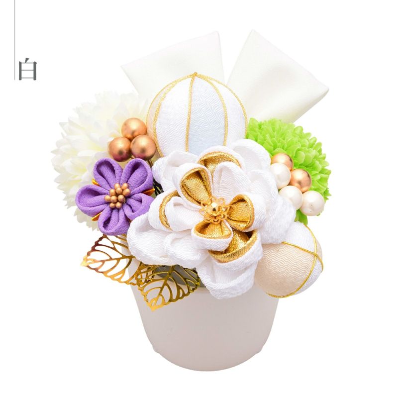 白:やわらかい白のリボン飾り。つまみのお花・大は白にゴールド、花芯もゴールド。つまみの小は落ち着いた藤紫色にブロンズの花芯。ポンポンマムのような造花は、大がクリーム色、中が深い黄緑色の各1点。玉飾り大小は白にごく淡い水色、生成り色を組み合わせ、金糸の縁取りがあります。ゴールドの透かしの葉が2点。ビーズ飾りはつやのあるアイボリーとブロンズを組み合わせたもの、ブロンズビーズが1点ずつ。