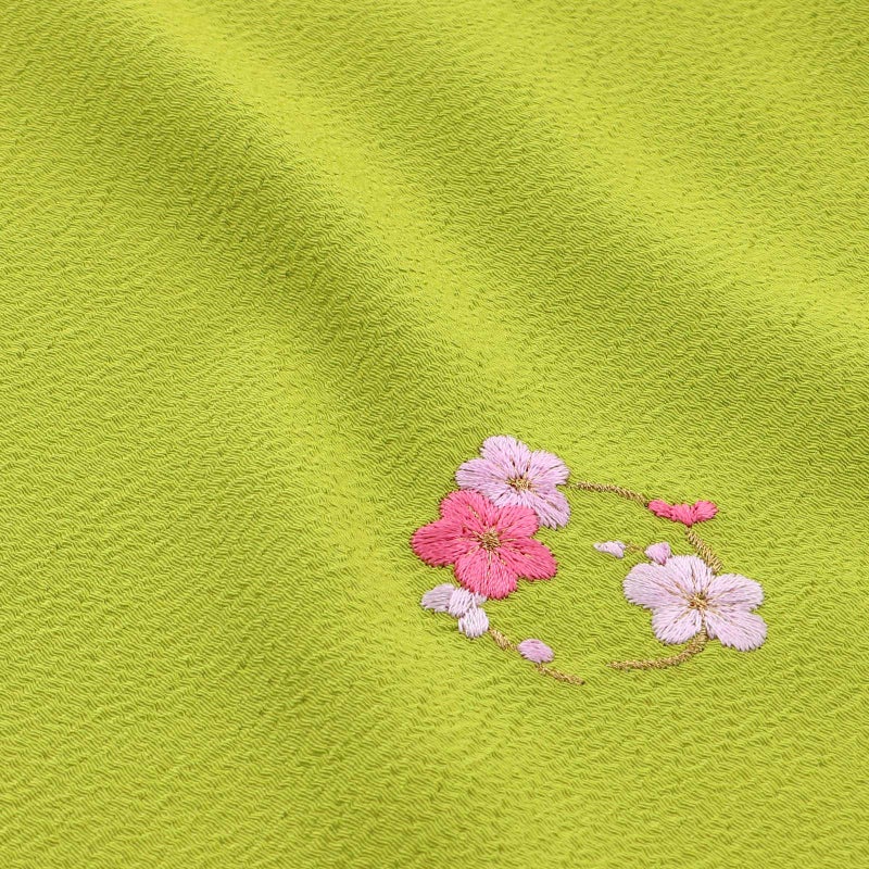 【カラー】やや鈍い黄緑色系の鶸萌黄色の地。ピンク、濃いピンクに金糸の刺繍で表現された梅の花の丸。