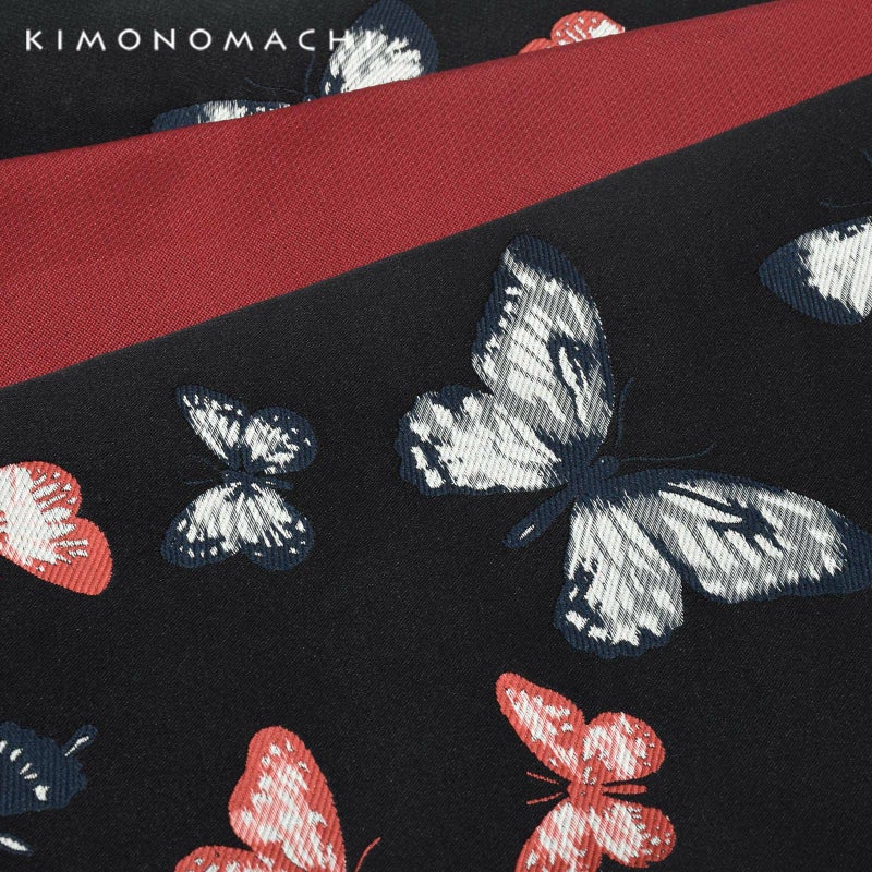 つやのある黒地に、群れ飛ぶ蝶々の柄。大小の蝶々は、紺色とやわらかい赤系の真朱色。濃淡の色の変化によって、蝶が浮かび上がるかのように見えます。帯の上を蝶が華麗に舞うお洒落な帯です。裏地は、オシャレ心をくすぐる濃い赤色。