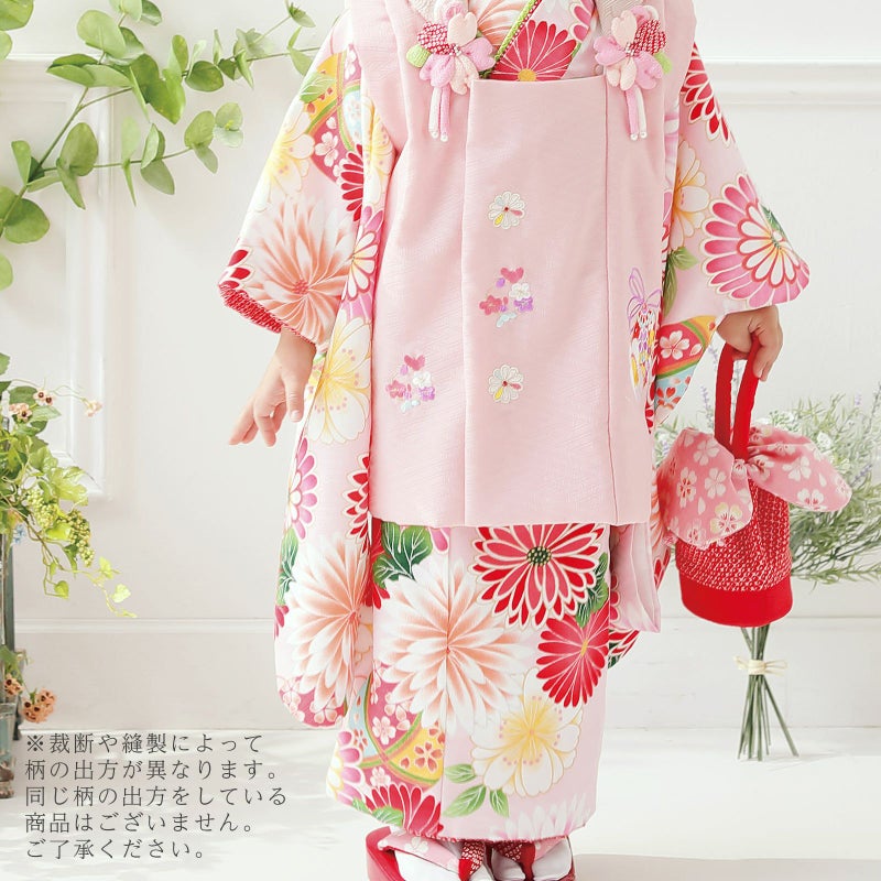 被布コートは淡いピンク色の地に、白や赤、ピンク、薄紫色の手毬や花の刺繍。被布飾りはピンクのつまみのお花。着物はごく淡いピンク色の地。白やピンク、淡い赤の菊の花を全体に散らし、桃色や薄黄、浅葱色の配色の手毬を配置した模様。重ね衿は黄緑と赤の二枚重ね。袖口、裾のふきは赤い鹿の子模様。草履は赤い台に赤い鹿の子模様とピンクの桜の鼻緒。巾着は赤の袋にピンク色地の桜の柄の返しがついています。ピンクや赤のつまみのお花の髪飾り。