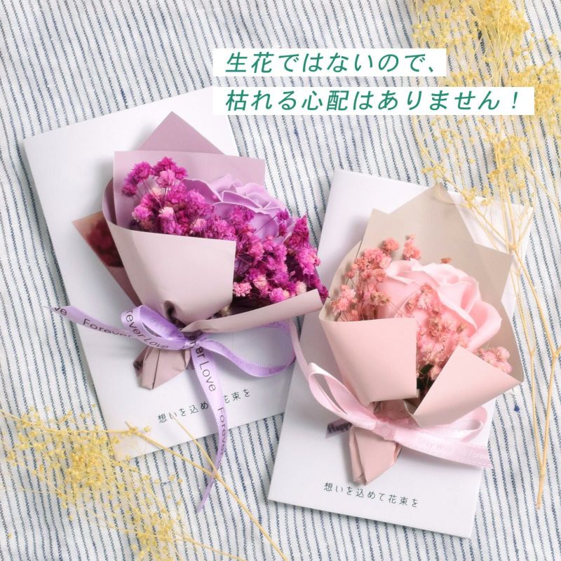 ローズはソープフラワー、カスミソウはプリザーブドフラワーです。