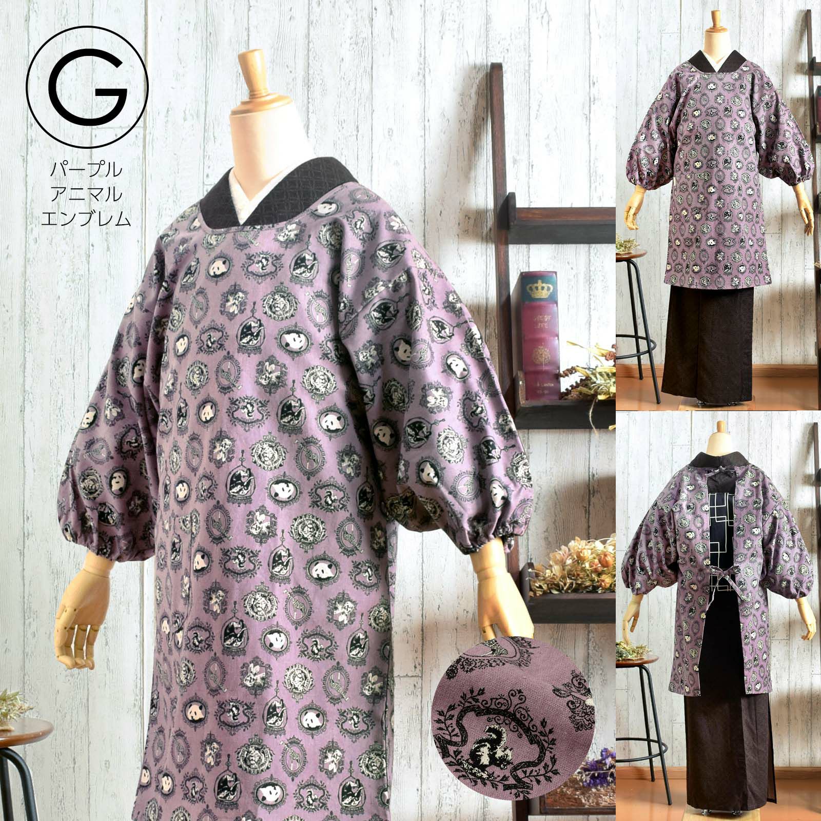 Gパープル アニマルエンブレム…グレイッシュな紫色の地に、浅い生成色と黒で動物の紋章が表現されています。パンダやリス、ウサギ、ゾウにライオン、キリンなど。
