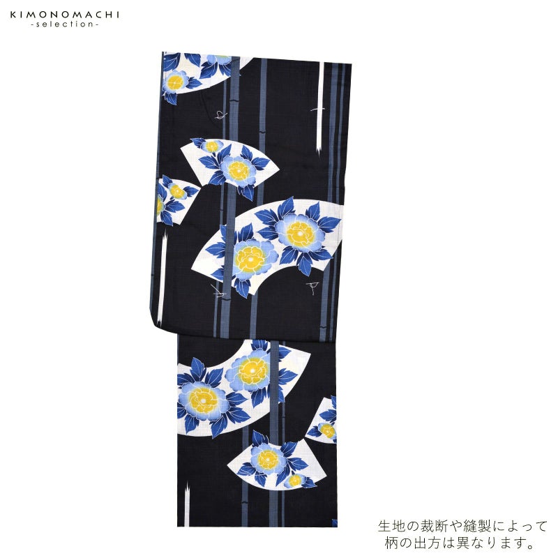 浴衣 レディース 単品 「黒地に花扇 竹」 フリーサイズ yukata 【メール便不可】