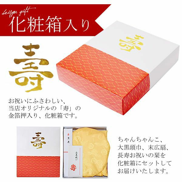 【商品内容】大黒頭巾、名前刺繍入りちゃんちゃんこ、末広(扇子)、栞、化粧箱の計5点