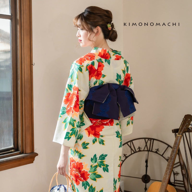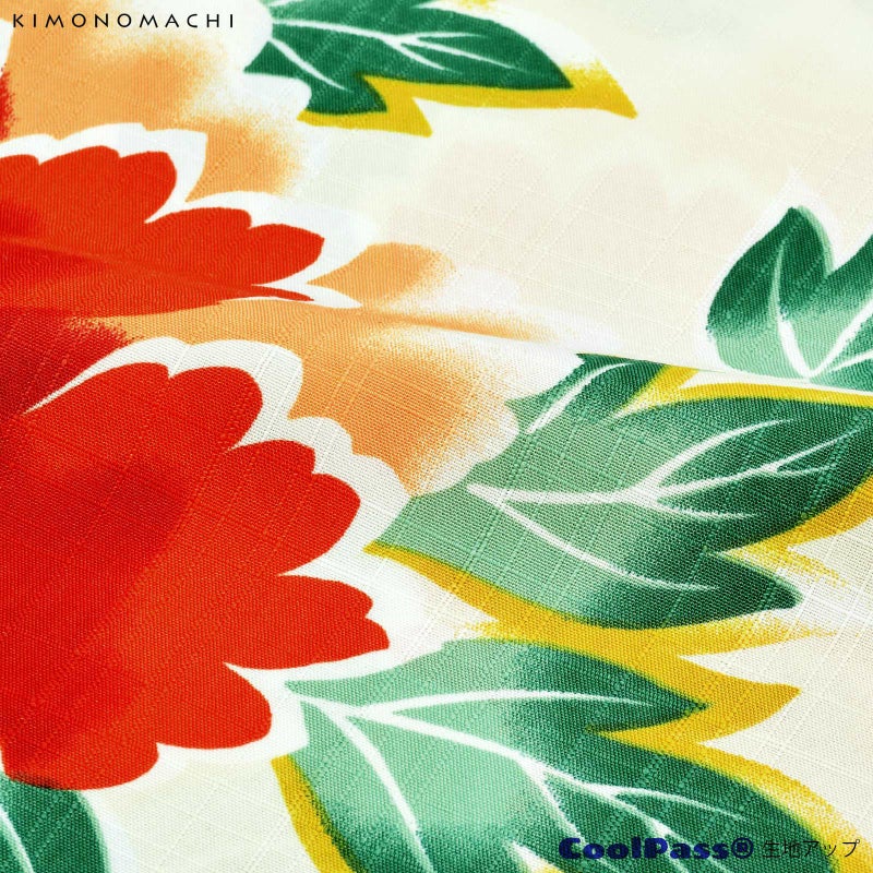 浴衣:淡いアイボリーの地に、大輪の緋牡丹の柄。あざやかな赤の濃淡や、淡いオレンジの花、緑色の葉。花びらの白、葉の金茶色の輪郭線が、強い印象を添えています。
