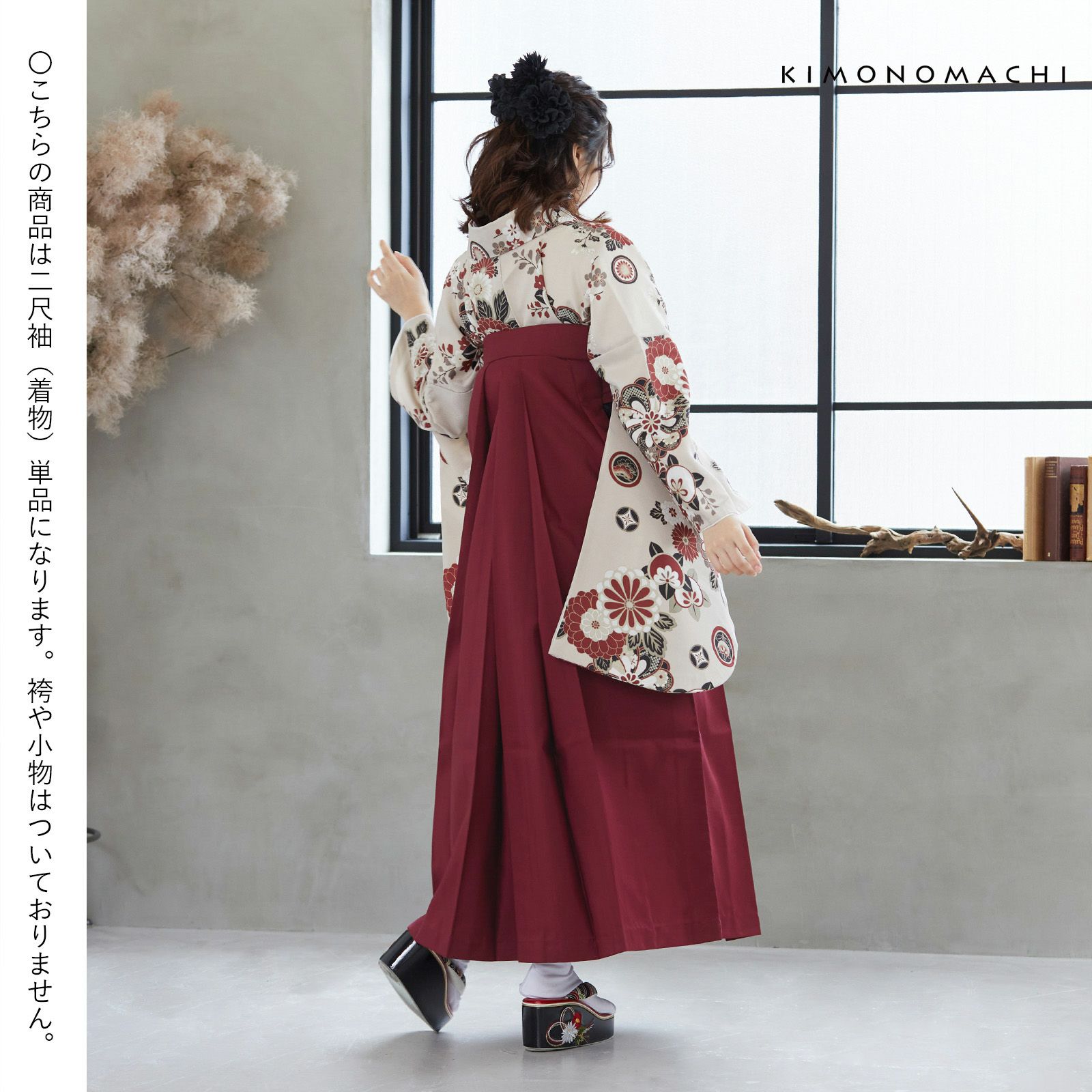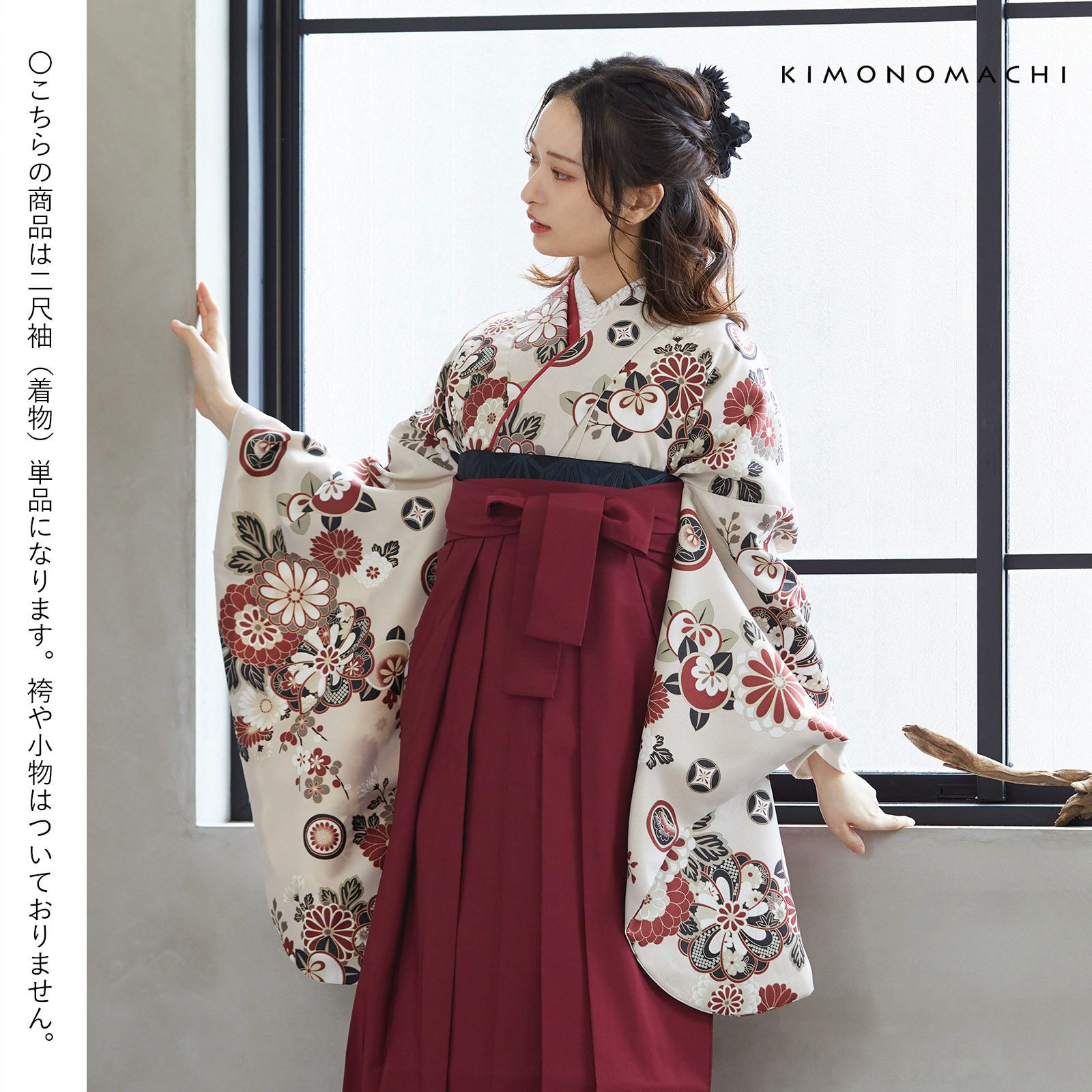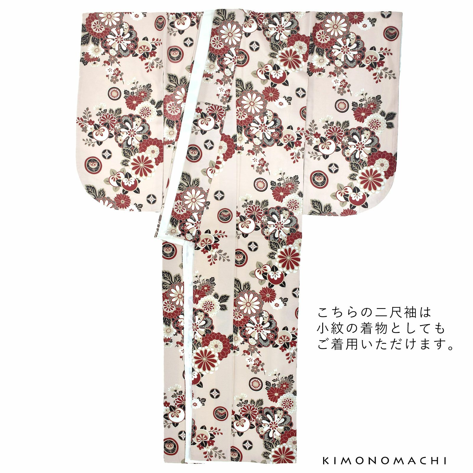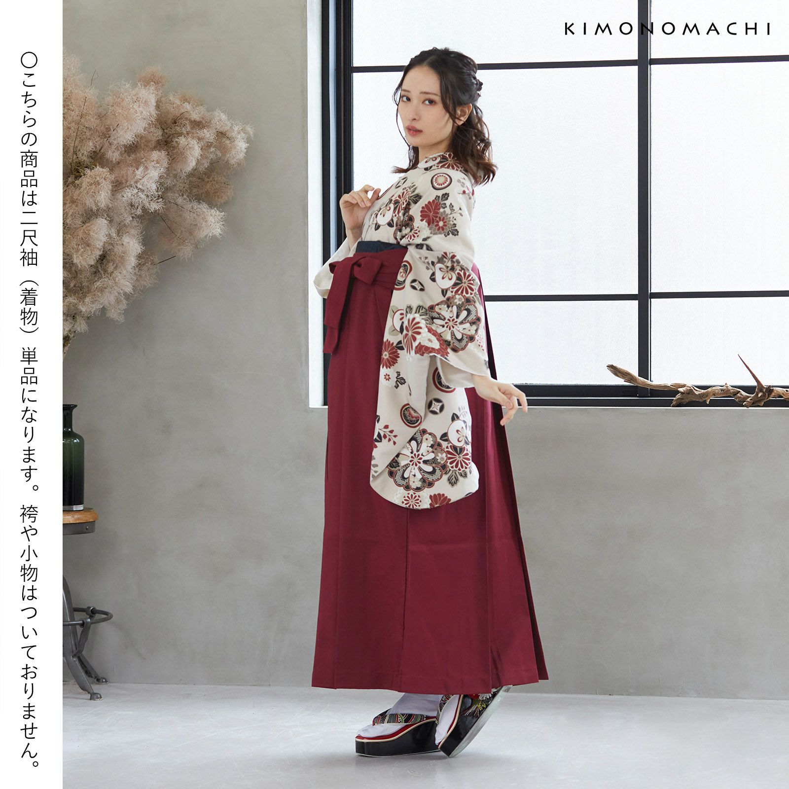 京都きもの町オリジナルブランド「KIMONOMACHI」の二尺袖着物単品です。袴と合わせて卒業式などの袴スタイルに。また身丈が通常の着物と同様の長さがございますので、袴無しで、袖が長めなアンティーク風着物としてもお召しいただけます。