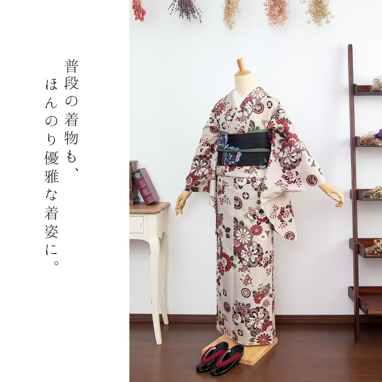 袴と合わせて、卒業式・謝恩会にぴったりの袴スタイルに。 普段着着物として、長めの袖でアンティーク風な着こなしに。