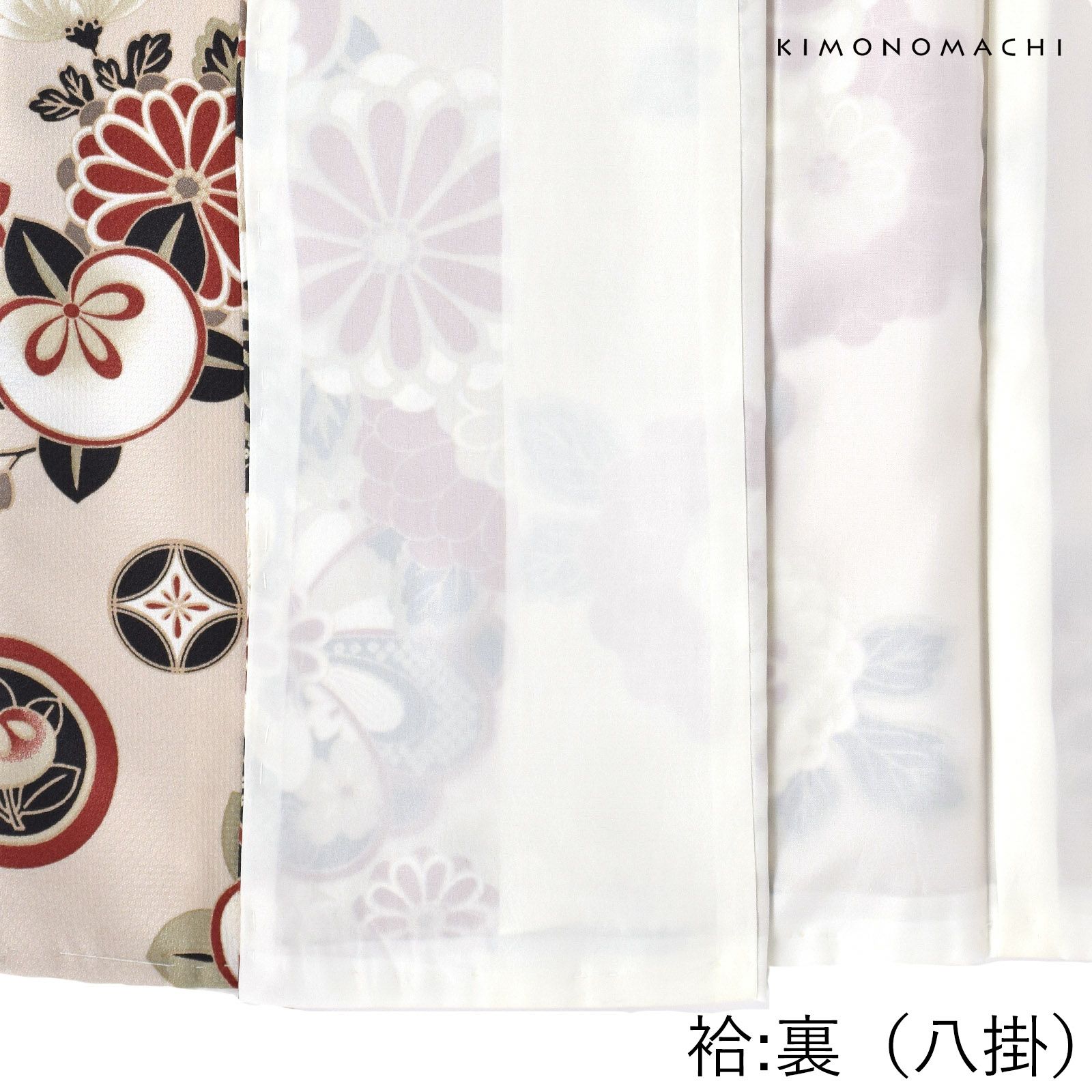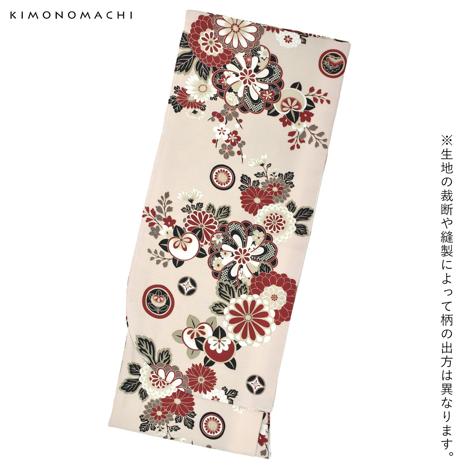 細かな地模様のある生地。浅いピンクベージュの地に、捻じ花や菊、橘、梅などのさまざまな花紋、松や七宝の小さな丸紋を散らしたデザイン。柄は臙脂、白、グレーを黒で引き締めた配色。落ち着いた雰囲気の中に古典的なかわいらしさがあります。裏地は白。