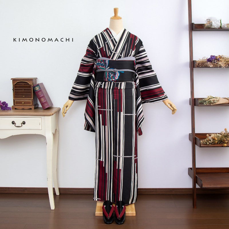 KIMONOMACHI オリジナル! 個性派洗える二尺袖着物 レトロモダン 古典柄 アンティーク着物風 (卒業式応援75%SALE 2/19迄)二尺袖着物 単品 「ラインカラー 灰色×赤」 KIMONOMACHIオリジナル お仕立て上がり レディース 洗える着物 二尺袖 着物 袴に合わせて 卒業式 謝恩会に 通常丈 長着 カジュアル着物 【メール便不可】ss2506kck20