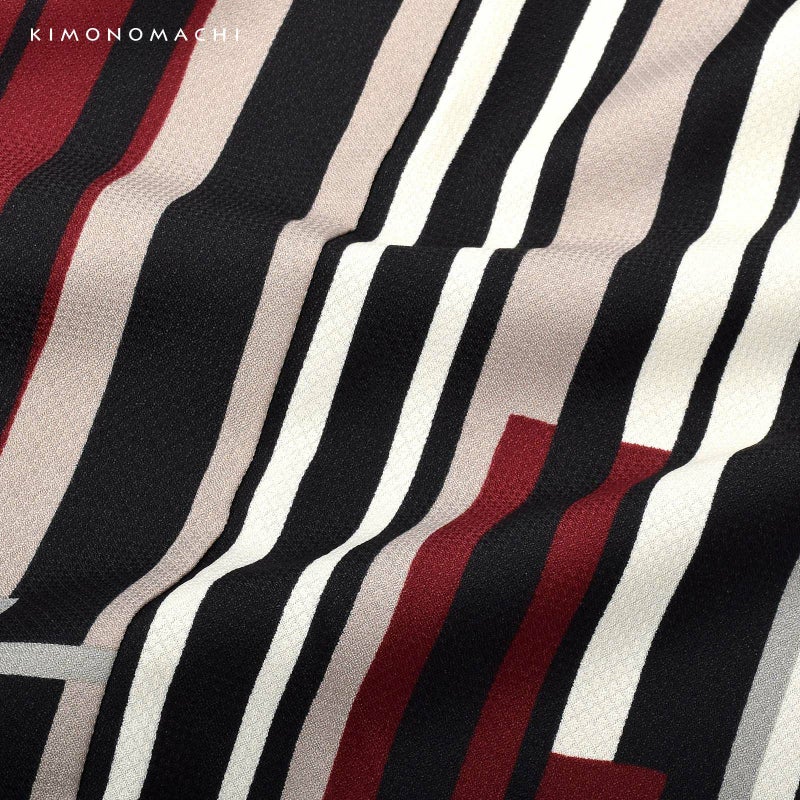 細かな地模様のある生地。黒をメインに、白、深い紅色にグレー、やや赤みのグレージュのランダムな縞。ところどころグレーのラインが横切るデザイン。スタイリッシュな格好良さとレトロな雰囲気を併せ持っています。裏地は臙脂。