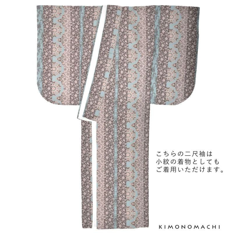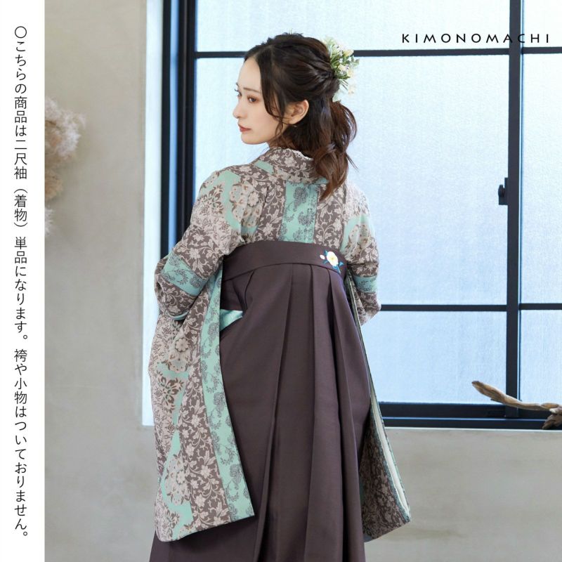 京都きもの町オリジナルブランド「KIMONOMACHI」の二尺袖着物単品です。袴と合わせて卒業式などの袴スタイルに。また身丈が通常の着物と同様の長さがございますので、袴無しで、袖が長めなアンティーク風着物としてもお召しいただけます。