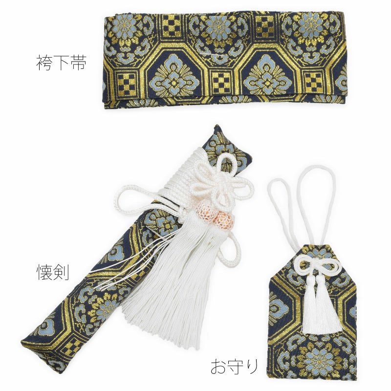 男の子向けの袴、袴下帯、懐剣、お守りの4点セットです。