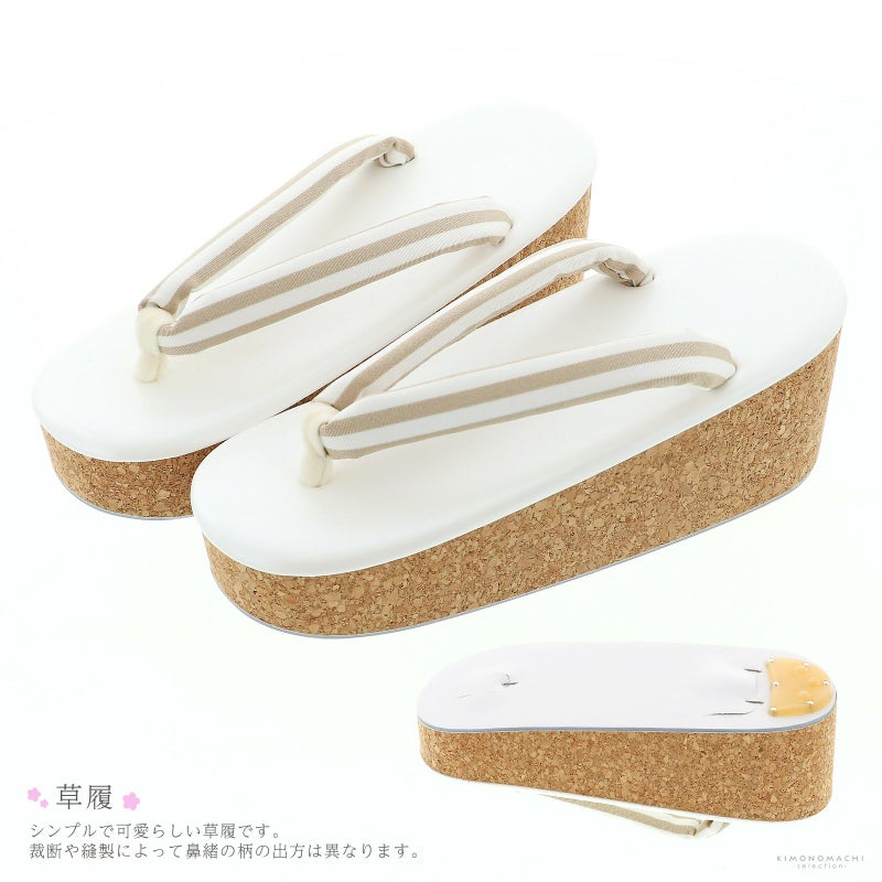 草履の台はコルク、天はやわらかい白。鼻緒は白と淡いブラウンのストライプ。前坪はオフホワイト。