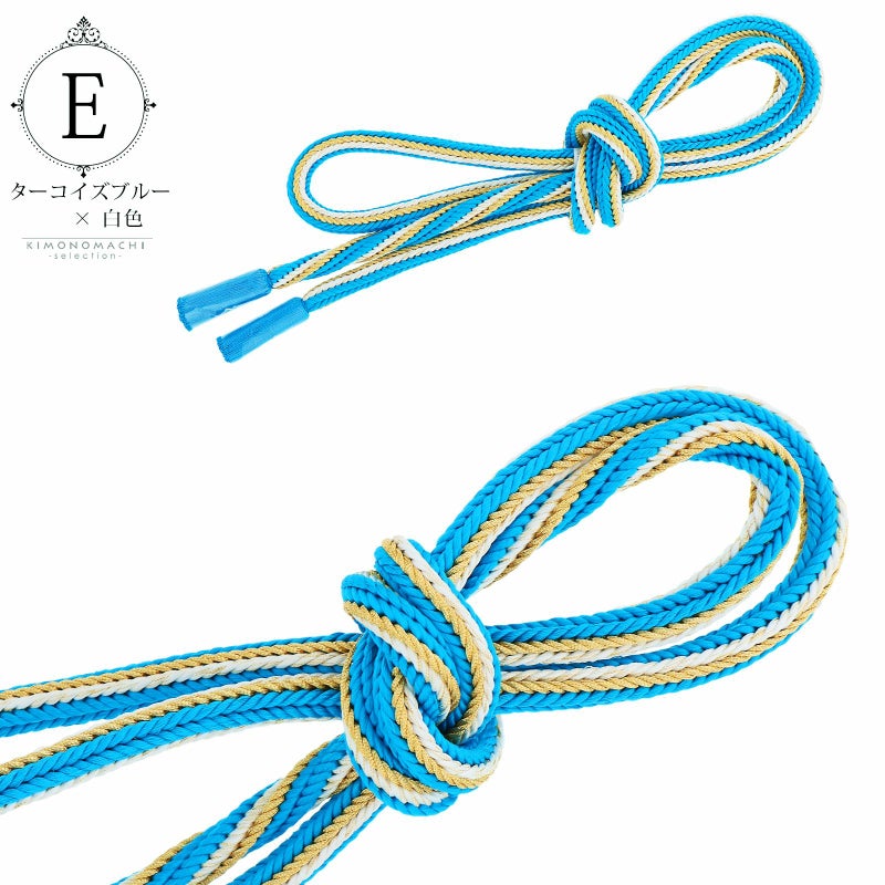 E.ターコイズブルー×白色…ターコイズブルーをメインに、白、ゴールドが斜めにより合されたデザインの帯締めです。