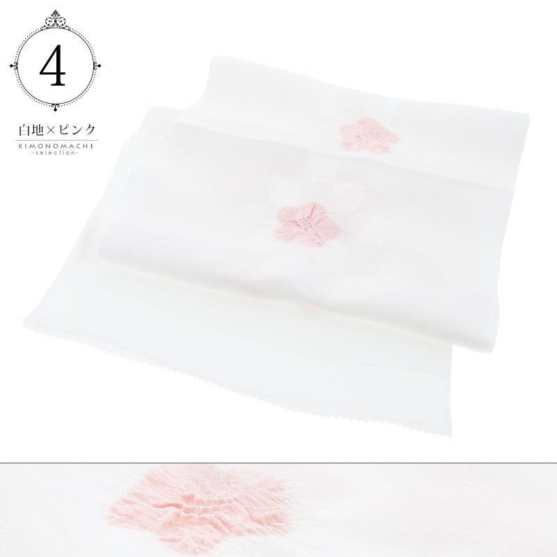 4.白地×ピンク…白に織りで表現された市松の地模様。やや灰みの淡いピンク色の絞りの梅の花。