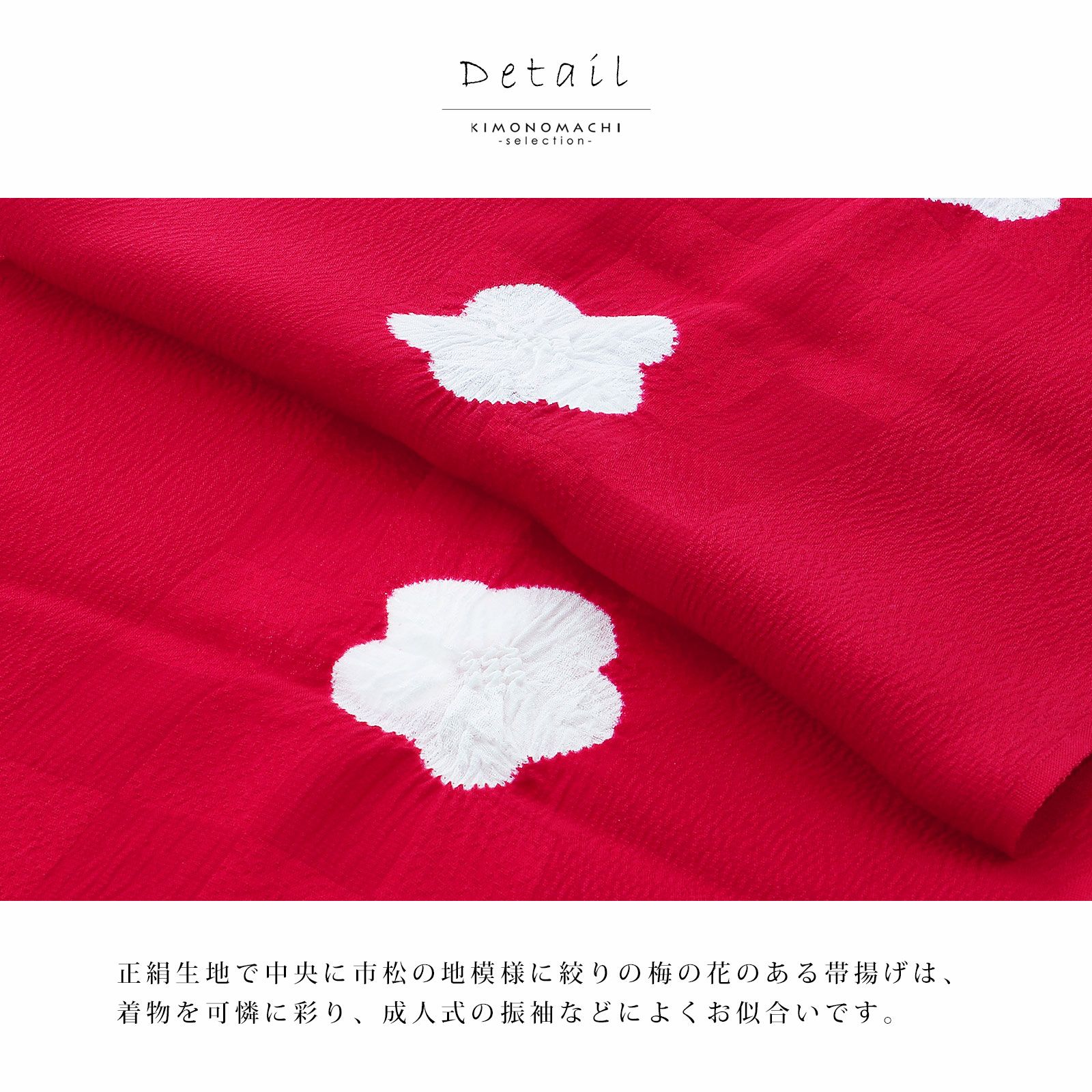 帯揚げは見える部分は限られますが、帯の上部分に見えるので、お写真を撮る際の上半身アップなどでは特に目立つので手を抜けません。華やかさはありつつもシンプルなモチーフで合わせやすく、カラーバリエーションも豊富なので、コーディネートの幅を広げてくれる帯揚げです。