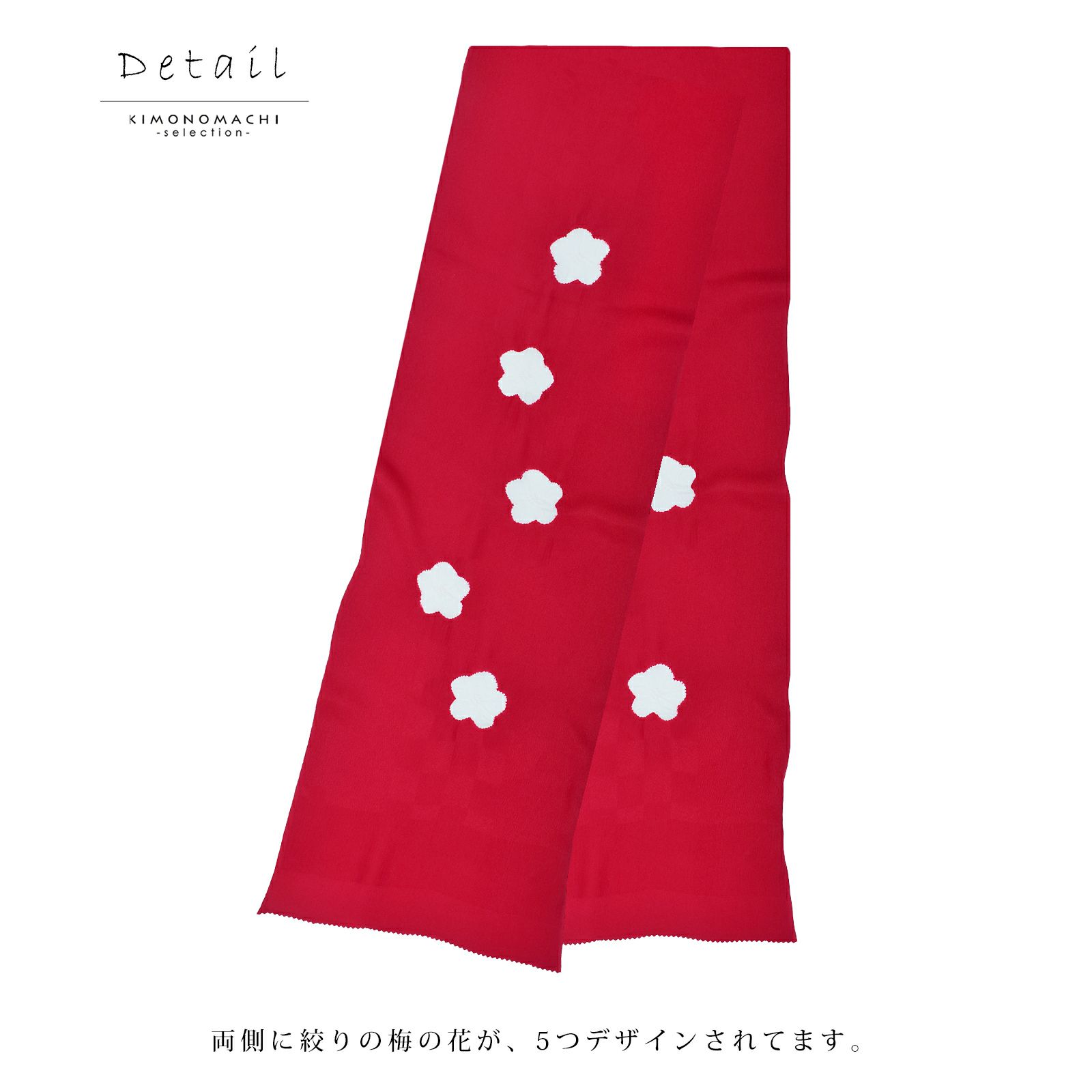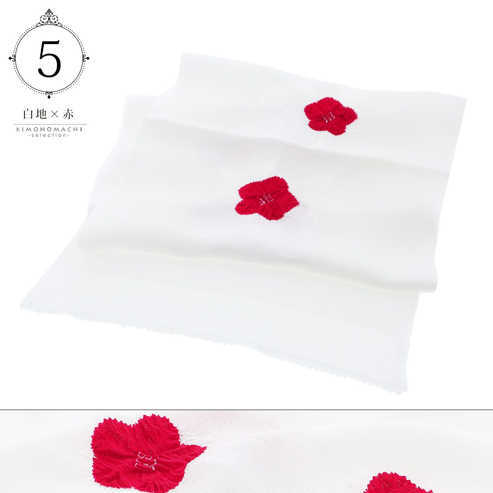 5.白地×赤…白に織りで表現された市松の地模様。深い赤色の絞りの梅の花。