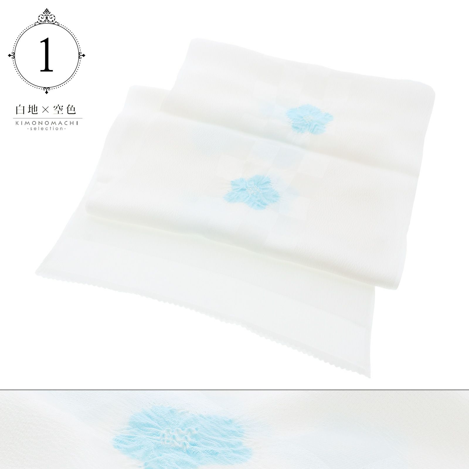 1.白地×空色…白に織りで表現された市松の地模様。淡い水色の絞りの梅の花。