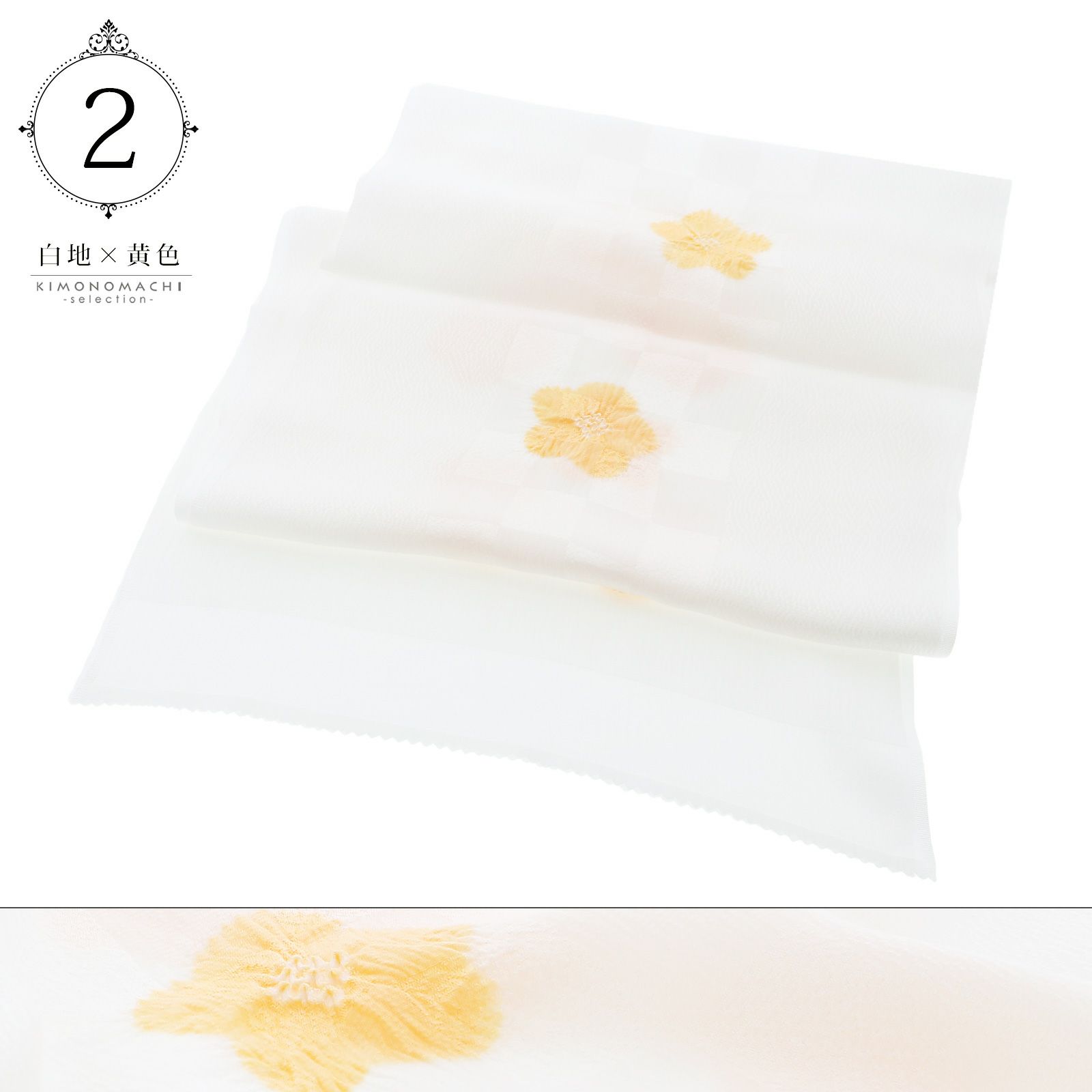 2.白地×黄色…白に織りで表現された市松の地模様。淡い黄色の絞りの梅の花。