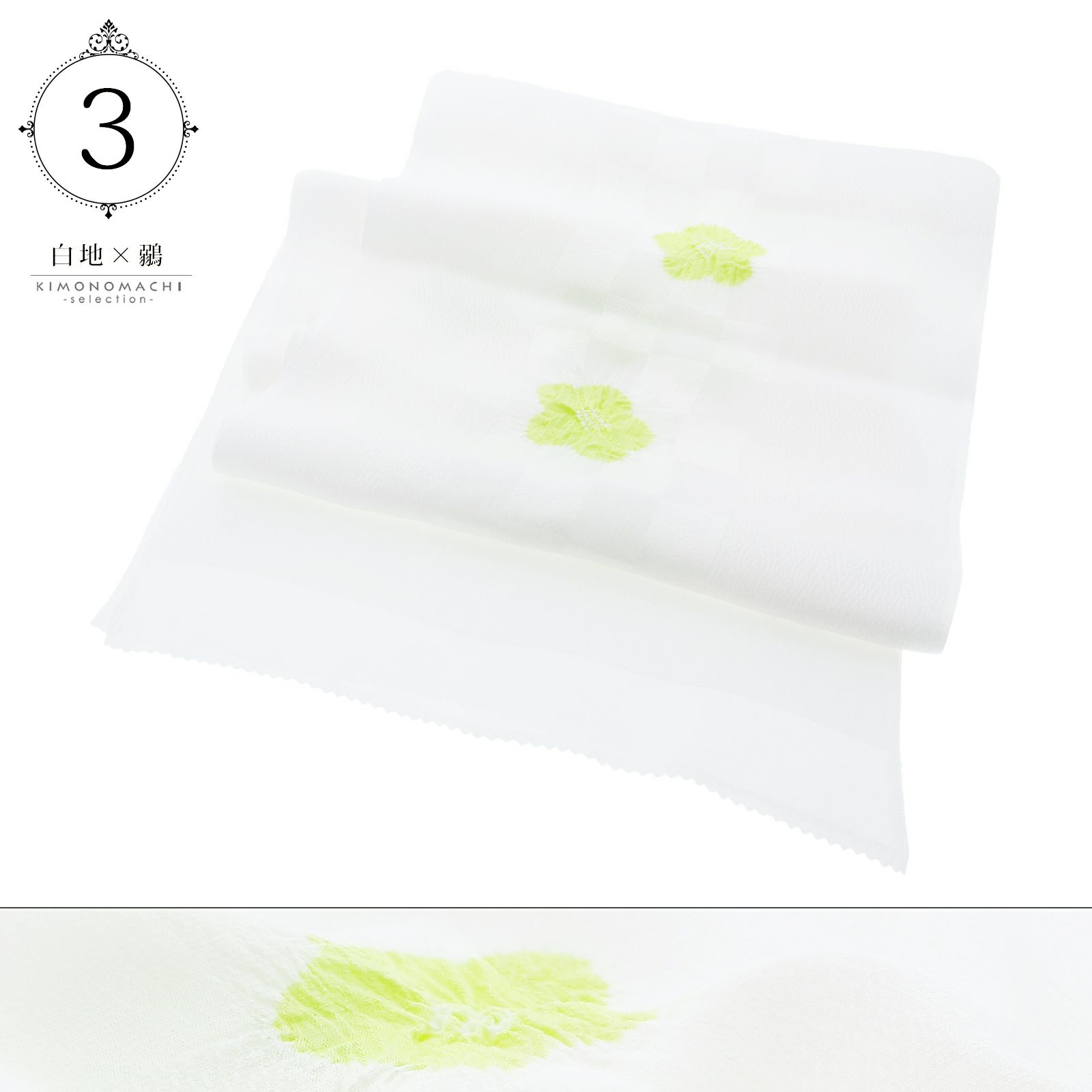 3.白地×鶸(ひわ)…白に織りで表現された市松の地模様。淡い黄緑色の絞りの梅の花。