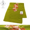 3.鶸…深い黄緑色の地に薄黄色や浅い赤色の輪郭に白い花びら、金の輪郭に赤色の疋田文様、淡いピンク色などの桜紋の刺繍。立体感のある変わり織りの生地やポイントの金糸が華やかな印象に。