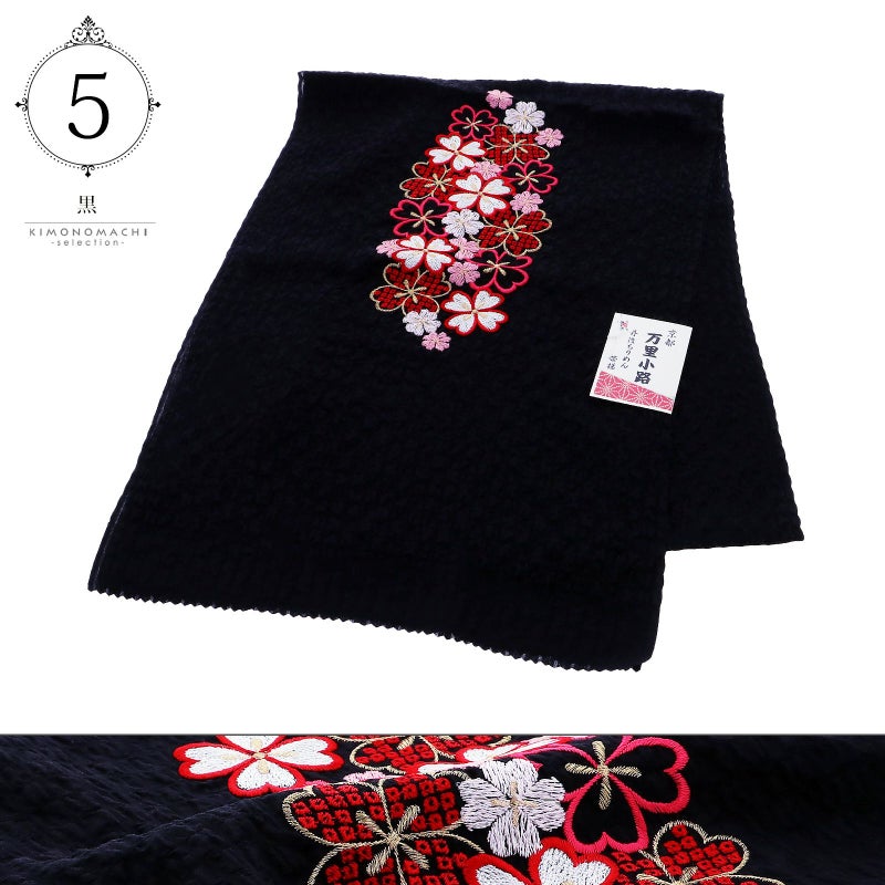 5.黒…黒地に赤や躑躅色の輪郭に白い花びら、金の輪郭に赤の疋田文様、淡いピンク色などの桜紋の刺繍。立体感のある変わり織りの生地やポイントの金糸が華やかな印象に。