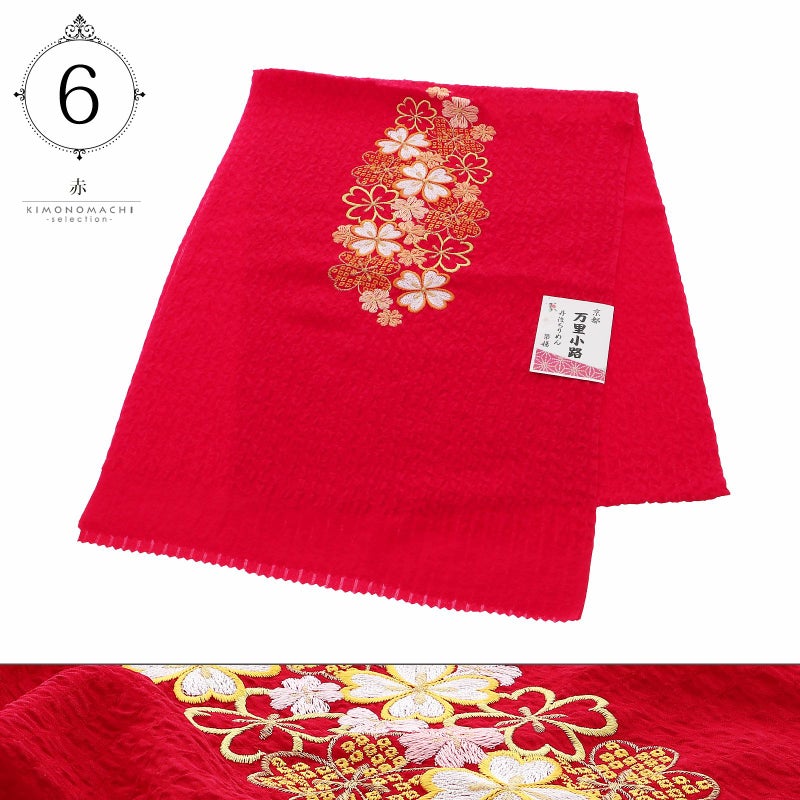 6.赤…深い赤地に山吹色や薄黄色の輪郭に白い花びら、金の輪郭に山吹色の疋田文様、淡いピンク色などの桜紋の刺繍。立体感のある変わり織りの生地やポイントの金糸が華やかな印象に。