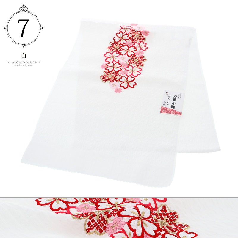 7.白…白地に赤や躑躅色の輪郭に白い花びら、金の輪郭に赤の疋田文様、淡いピンク色などの桜紋の刺繍。立体感のある変わり織りの生地やポイントの金糸が華やかな印象に。