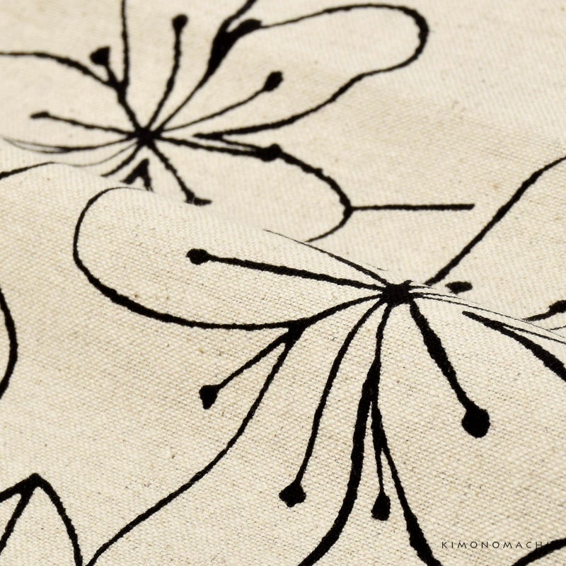 ざっくりとした風合いのベージュの地。ペンで描かれたかのような、黒い線のお花の柄。
