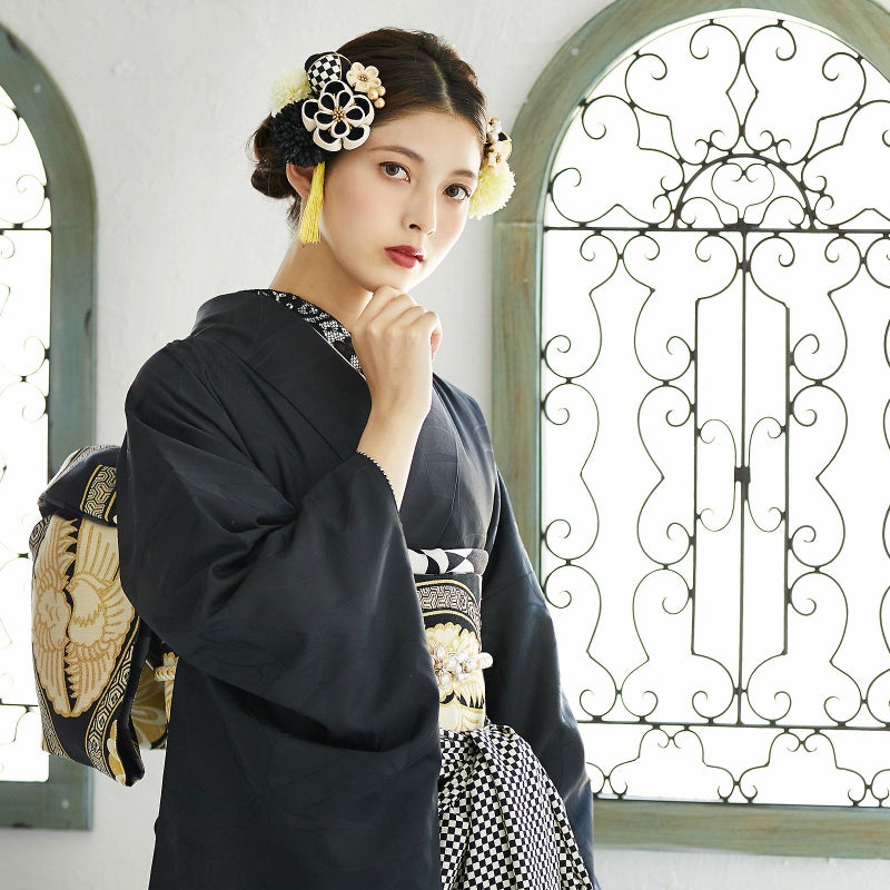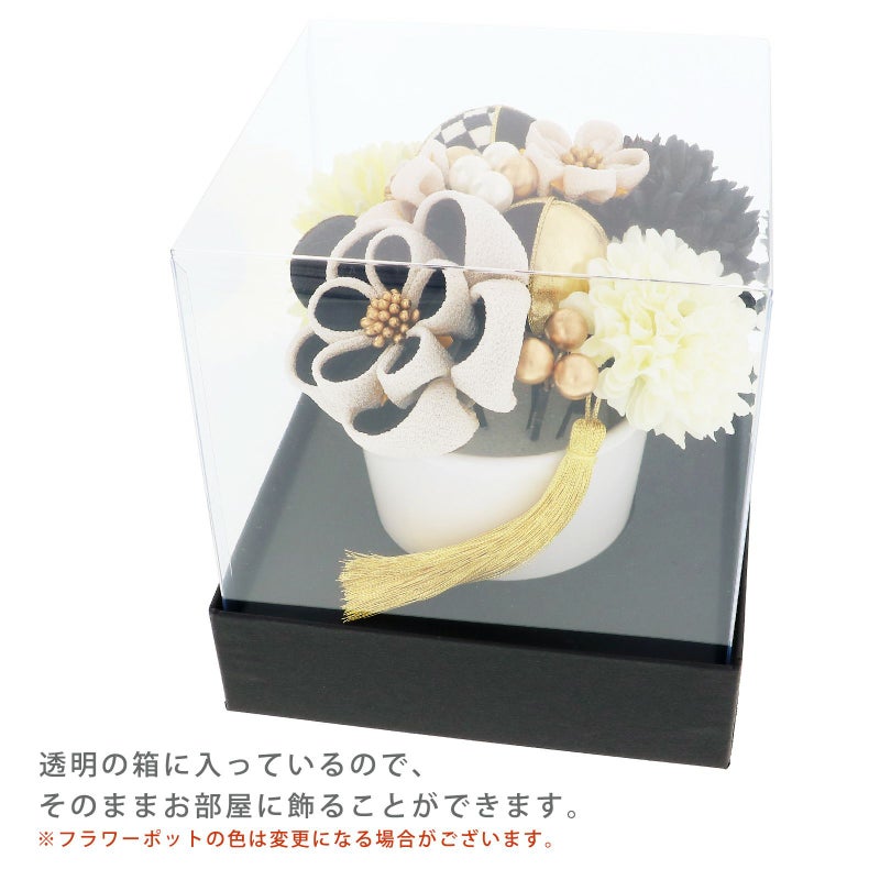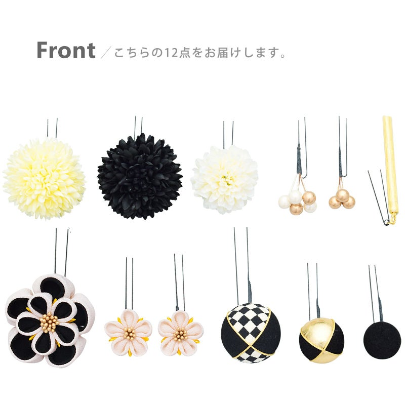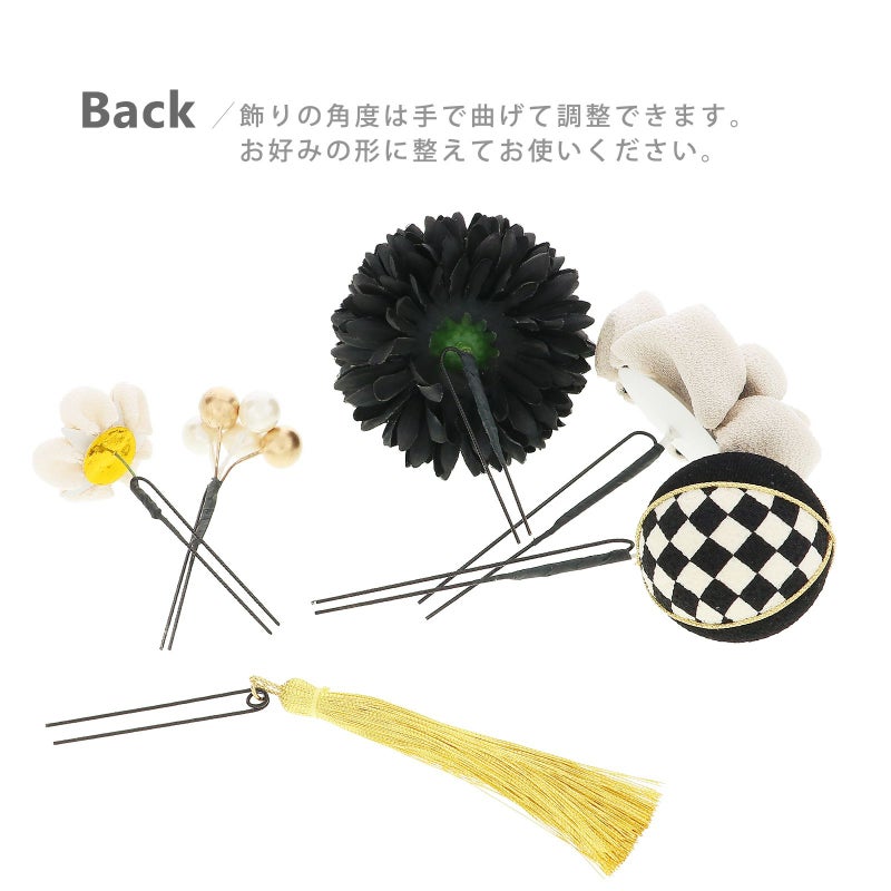 黒:つまみのお花・大は内側が黒、外側がベージュのバイカラー、ブロンズの花芯、小はベージュが2点。ポンポンマムのような造花は、淡いクリーム色、黒、オフホワイトが各1点。玉飾りの大は黒と白黒の市松柄に金の縁取り、中は黒とゴールド、小は黒。ビーズ飾りホワイトとブロンズ、ブロンズビーズが1点ずつ。明るい金色のタッセル飾り。