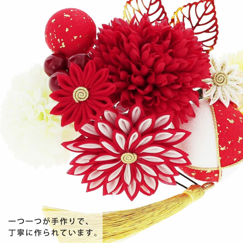 赤:赤と白の剣つまみ、ゴールドの蕊の大花八重菊が1点、小花は赤の剣菊1点、白とゴールドの剣菊1点。マム・大は落ち着いた赤1点、中はクリーム色1点、小はオフホワイト1点。玉飾り・大は赤地に金ラメと白のちりめんを組み合わせ、金糸の縁取り。中は赤地に金ラメ、金糸の縁取り。小は赤地に金ラメ。ビーズ飾りはつやのある赤5粒が1点、ブロンズビーズ3粒が1点。ゴールドの透かしモチーフの葉が2点。ゴールドのタッセル1点。