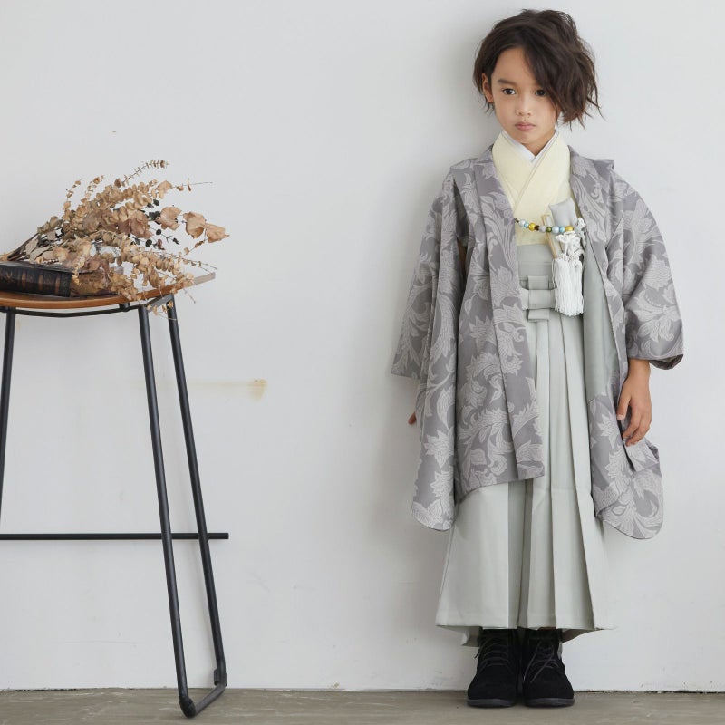 羽織は四角いドットの地模様、グレーの地にわずかに赤みの薄グレーの唐草文様。着物は浮線綾の地模様、色は淡いクリームイエロー。オフホワイトの重ね衿。白の襦袢がついています。袴は淡いグレー。袴と共布の帯と懐剣。カラービーズの羽織紐。オリエンタルな柄をモダンな雰囲気にまとめたセットです。