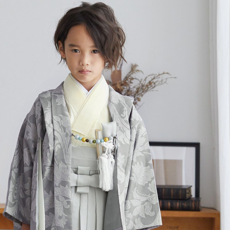5. 【Prices down2】七五三 着物 男の子 3歳~5歳 ブランド羽織袴セット petite liberte プチリベルテ「唐草グレー クリーム アイスグレー」小柄な五歳 大きな三歳向け 対応身長105cm~115cm前後 着物セット 男児用 3才~5才 着物セット 子供着物 五才のお祝い着 3歳~5歳【送料無料】【メール便不可】ss2509kkd15