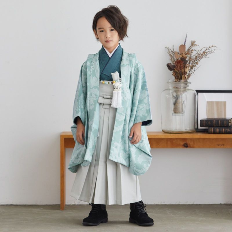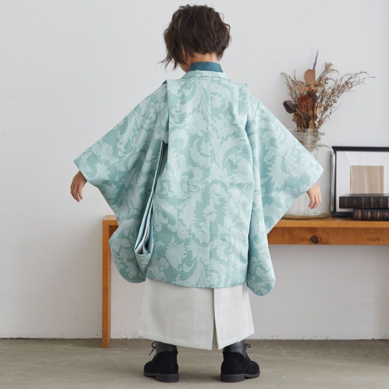 羽織は四角いドットの地模様、やや灰みの水色の地に薄水色の唐草文様。着物は浮線綾の地模様、色はグレイッシュな深い青。深い紺の重ね衿。白の襦袢がついています。袴は淡いグレー。袴と共布の帯と懐剣。カラービーズの羽織紐。オリエンタルな柄をクールな雰囲気にまとめたセットです。