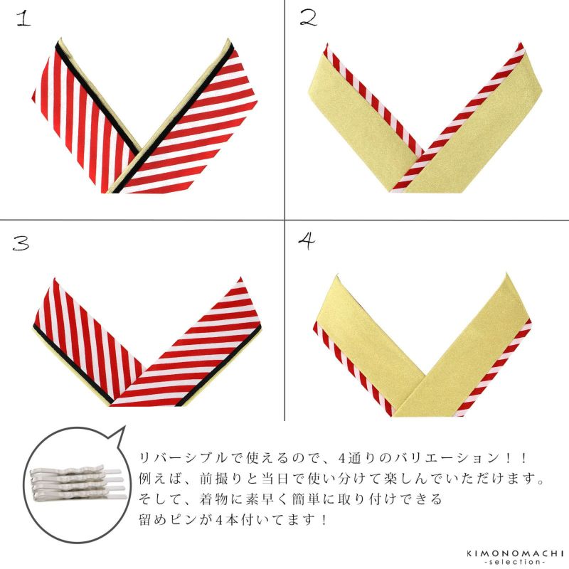 (卒業式応援10%OFFCOUPON1/22迄)重ね衿 振袖用 伊達衿 正絹 「赤ストライプ×黒×ゴールド」 コームピン(衿止めピン)付き リバーシブル 4way 両面重ね衿 モダン カラフル 縞 豪華 成人式 重ね襟 振袖 卒業式 袴 二尺着物 フォーマル 着物 伊達襟 振袖小物 日本製 【メール便対応可】<H>ss2409wkm10