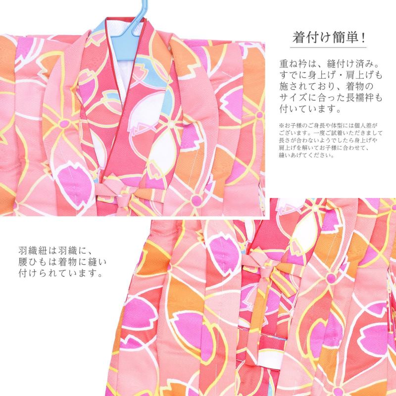 女の子の着物セットです。すぐに着られて動きやすく、ポリエステル素材なのでご家庭でお洗濯していただけます。