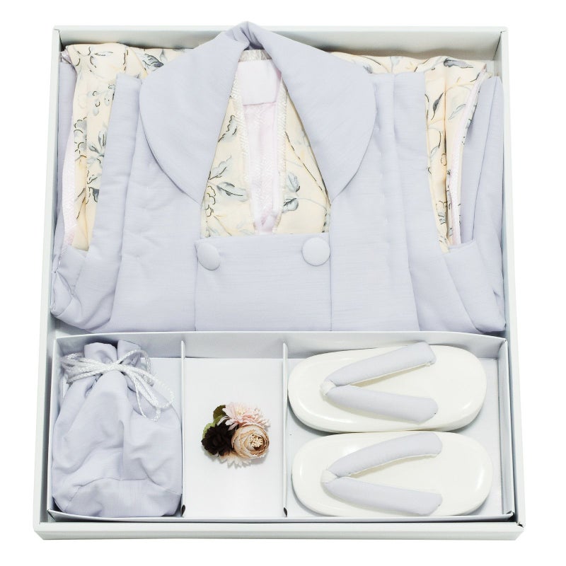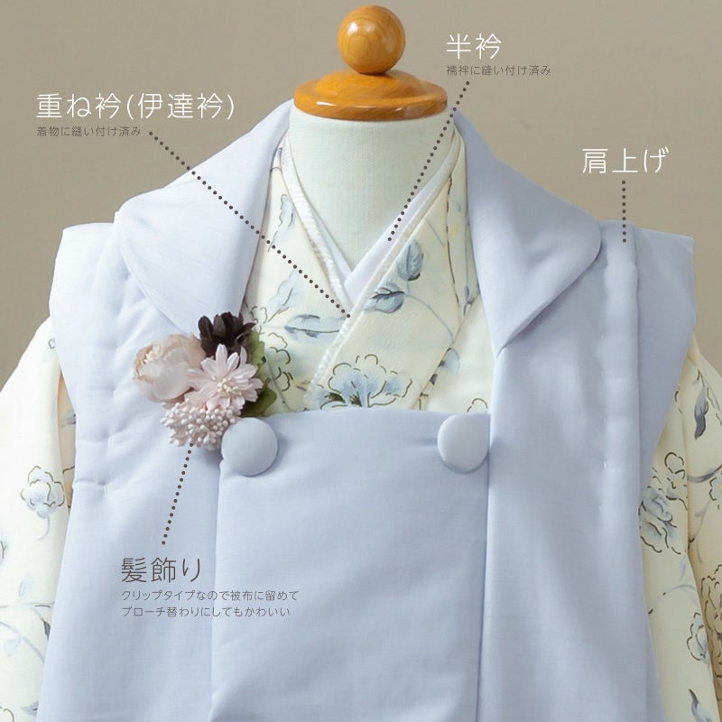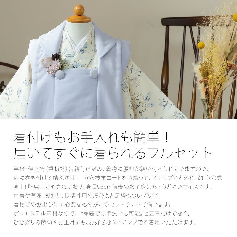 長襦袢・半衿(縫い付け済)・着物(腰ひも付き)・重ね衿(縫い付け済)・被布コート・巾着・草履・髪飾り・化粧箱のセットです。