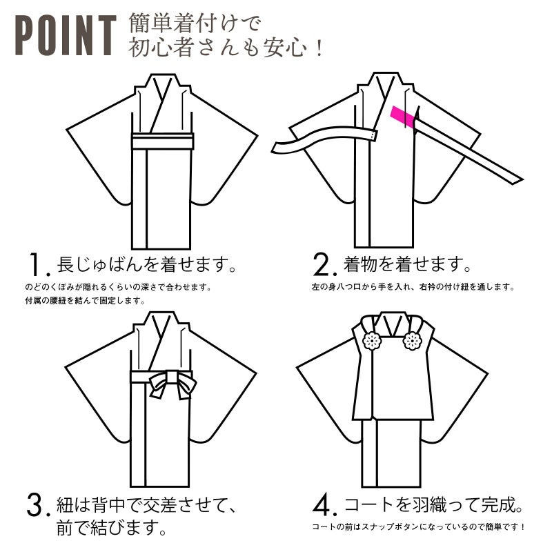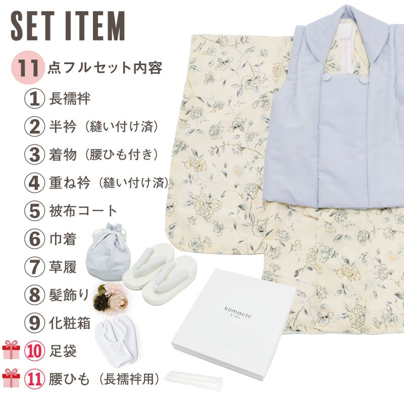 【商品内容】長襦袢・半衿(縫い付け済)・着物(腰ひも付き)・重ね衿(縫い付け済)・被布コート・巾着・草履・髪飾り・化粧箱・足袋(プレゼント)・腰ひも(長襦袢用/プレゼント)の11点セット