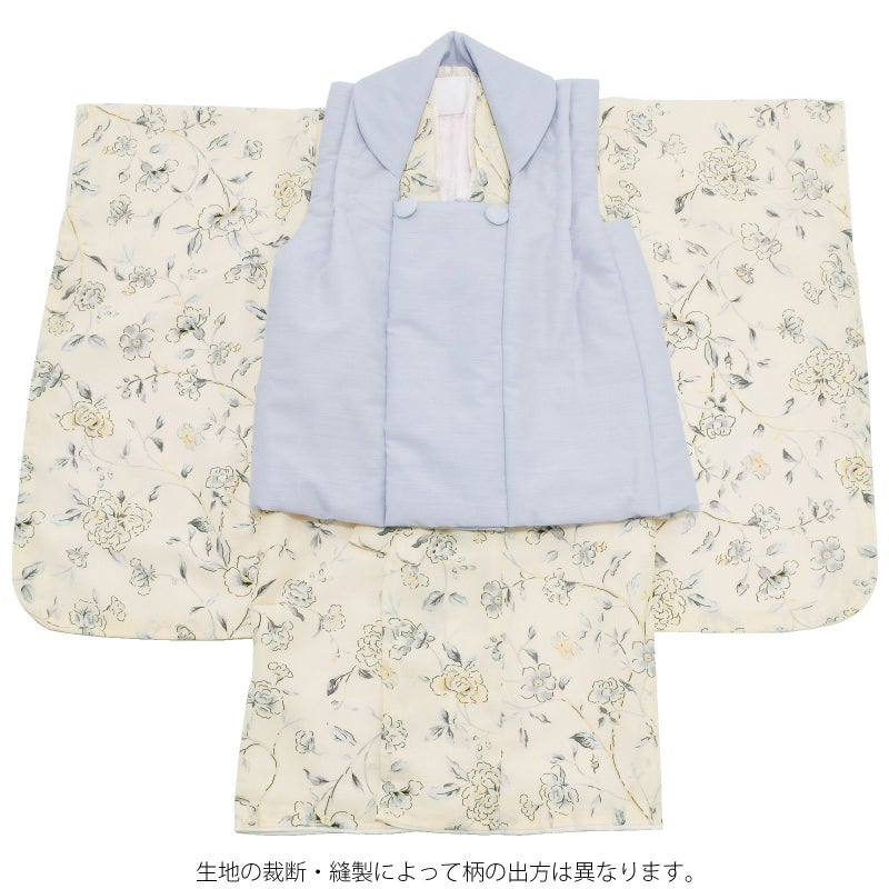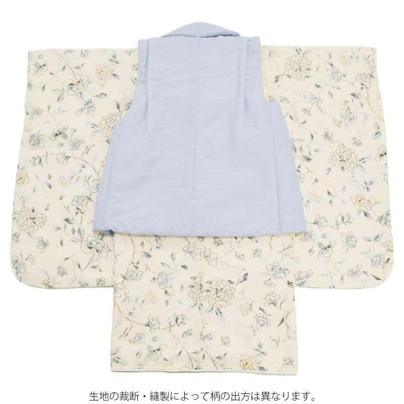 被布コートは淡いブルーラベンダー色、横に節の入ったシャンタン風の生地。くるみボタンの被布飾りがついています。着物は淡いクリームイエローの地にこげ茶の線、グレーの濃淡にたまご色の挿し色で表現された蔓薔薇風の花模様。重ね衿はクリーム色。長襦袢は淡いピンク色に紗綾型の地模様。白い半衿が付いています。巾着は被布と共生地。淡いピンクベージュ、ブラウン系のコサージュ髪飾り。草履は白い台にごく淡いブルーグレーの鼻緒。