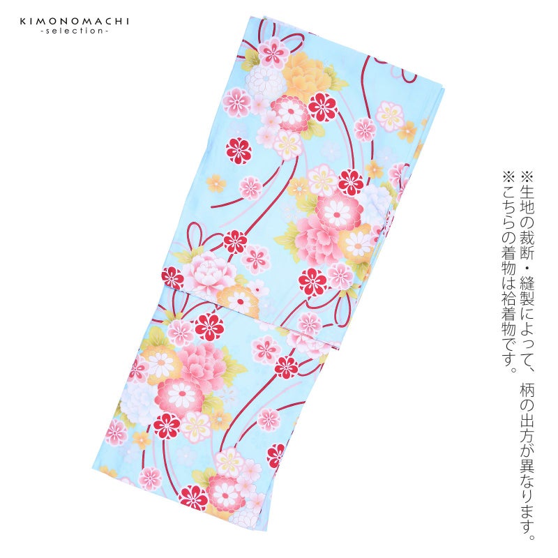 袷着物 単品 「水色地 牡丹・菊・梅・リボン」 フリーサイズ 着物 小紋 洗える着物 お仕立て上がり 普段着きもの カジュアル着物 レディース ポリエステル