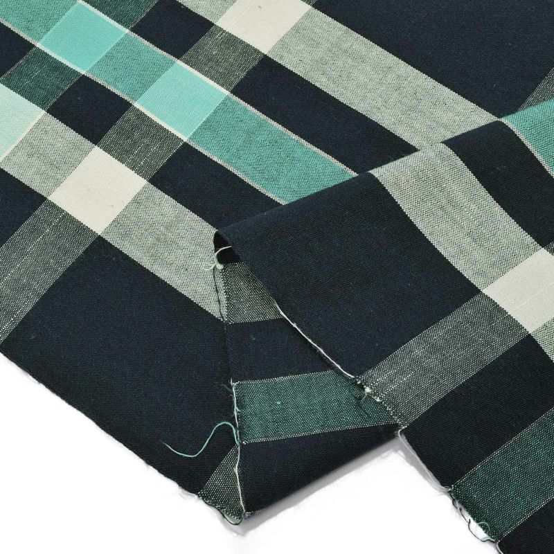 深い鉄紺に落ち着いた白、淡い浅葱色、横段に淡い色を重ねたチェック。夜風のような涼やかさのある格子です。