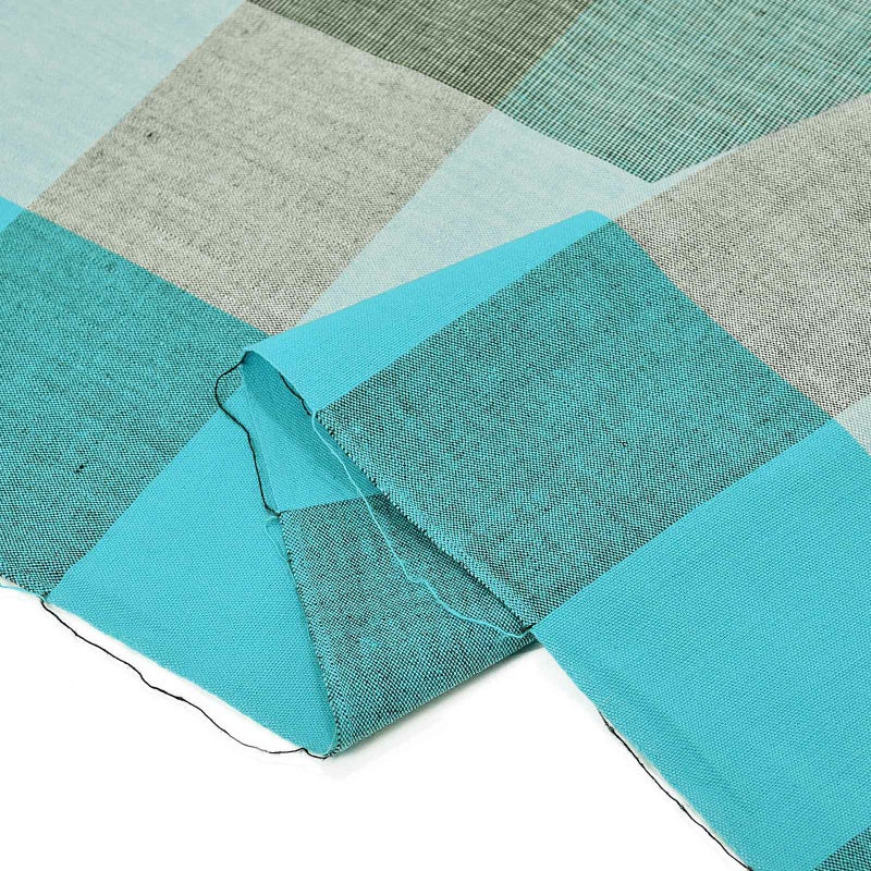 明るい水色、杢の淡い水色、杢の黒色、横段に薄い黒を重ねた約7cm弱ほどのブロックチェック。涼やかな印象の水色系の格子です。