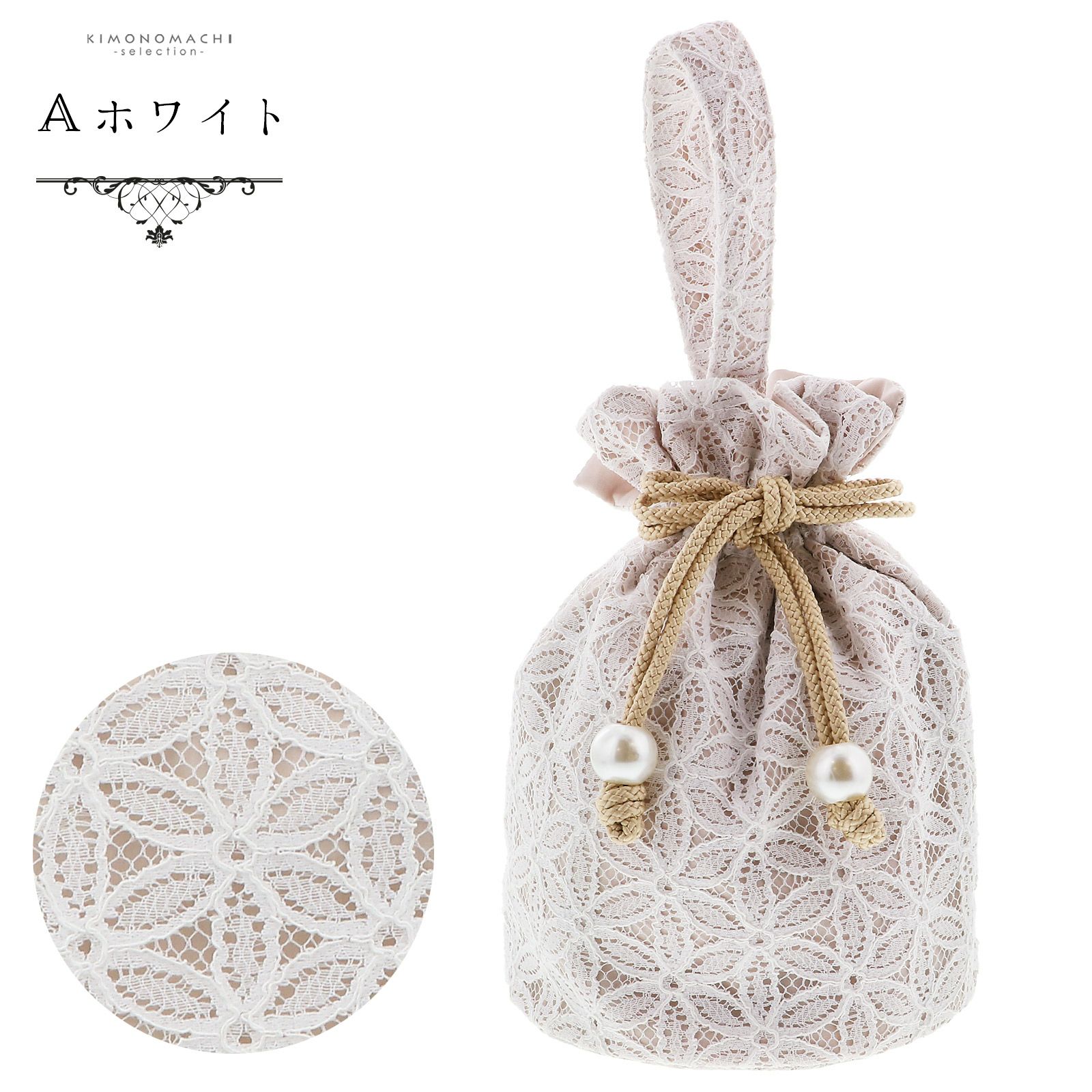 A.ホワイト…ベージュの裏地に白のフラワーレースを重ねた巾着。紐はベージュ。紐先に白のパール調のビーズ。