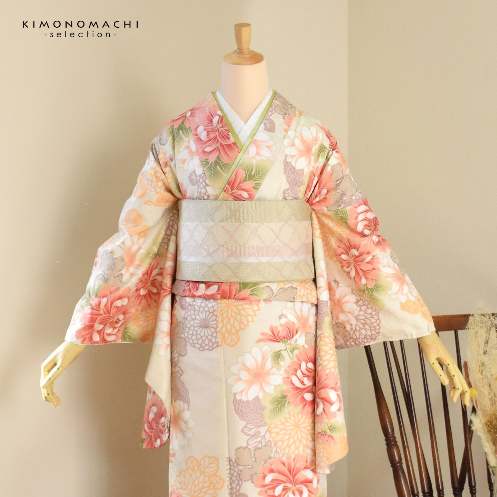 3. (卒業式応援SALE3/31迄)二尺袖着物 単品 「クリーム地 菊」 お仕立て上がり レディース 洗える着物 二尺袖 着物 袴に合わせて 卒業式 謝恩会に 通常丈 長着 カジュアル着物 【メール便不可】<H>