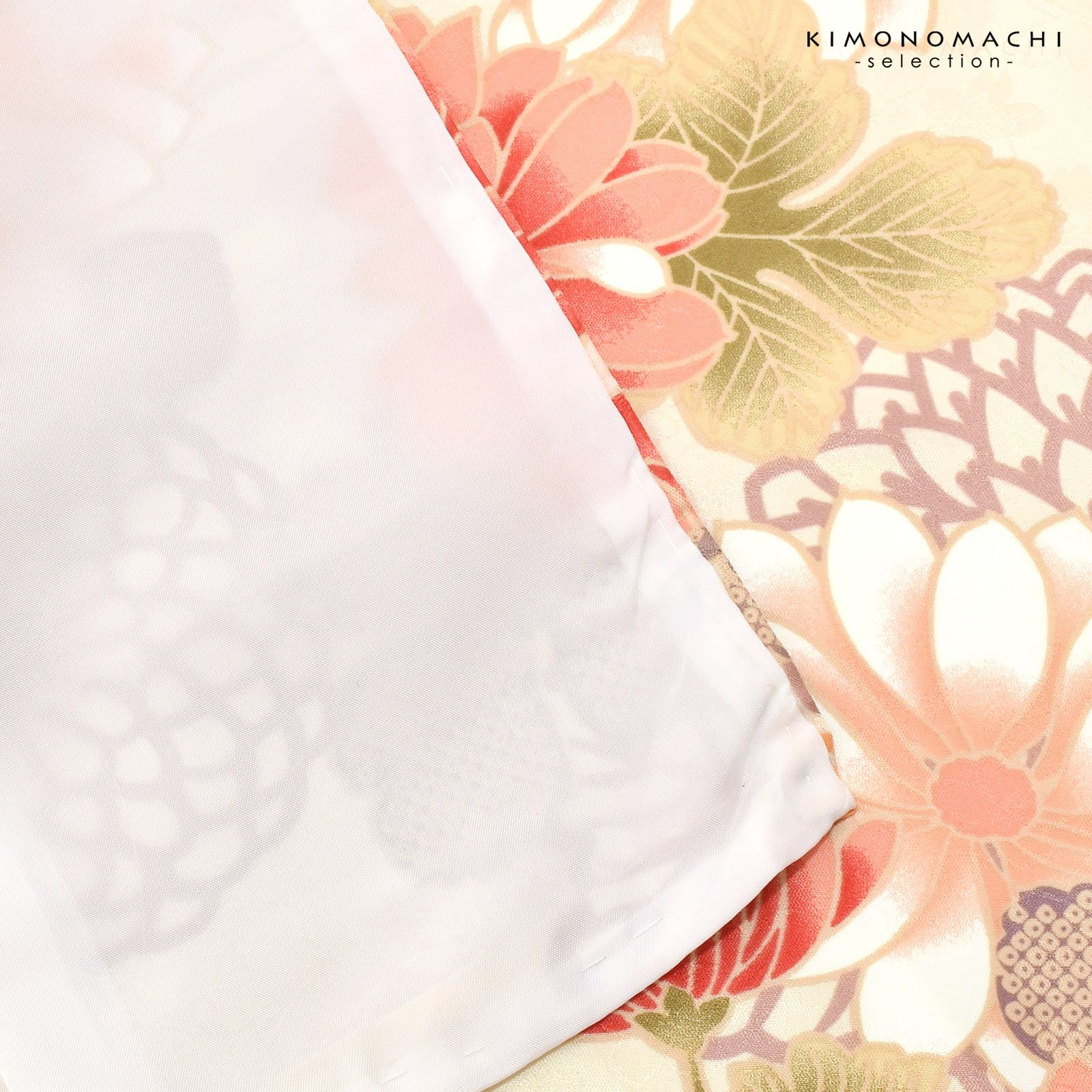 桜の地紋のある生地です。クリーム色の地に淡い橙色や藤鼠色の線で表現された八重菊。その上に、桃色に淡い朱色、コーラルピンク、アイボリーのぼかしの菊の花。淡い抹茶色や灰紫色の葉。明るい色合いが華やかな印象です。