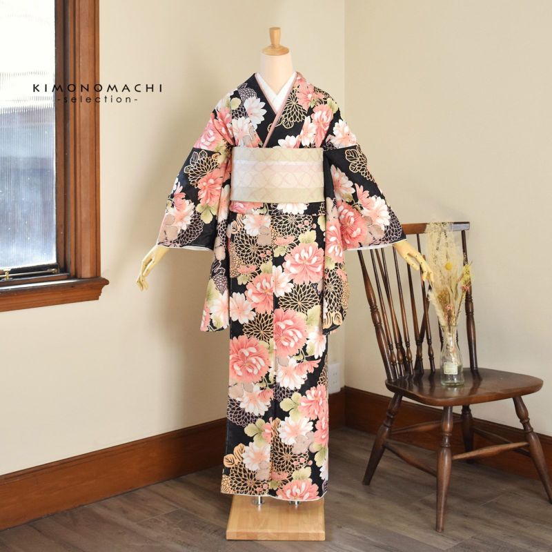 二尺袖着物 単品 「黒地 菊」 お仕立て上がり レディース 洗える着物 二尺袖 着物 袴に合わせて 卒業式 謝恩会に 通常丈 長着 カジュアル着物