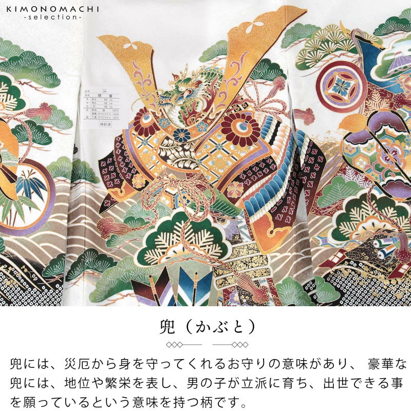 男の子らしく勇ましい、カッコイイ雰囲気。絹特有の柔らかな光沢、美しい発色の生地に美しい模様。長襦袢の中に水色の振りが入っており、お洒落な雰囲気をプラスしてくれます。細部に至るまで、こだわったお品です。