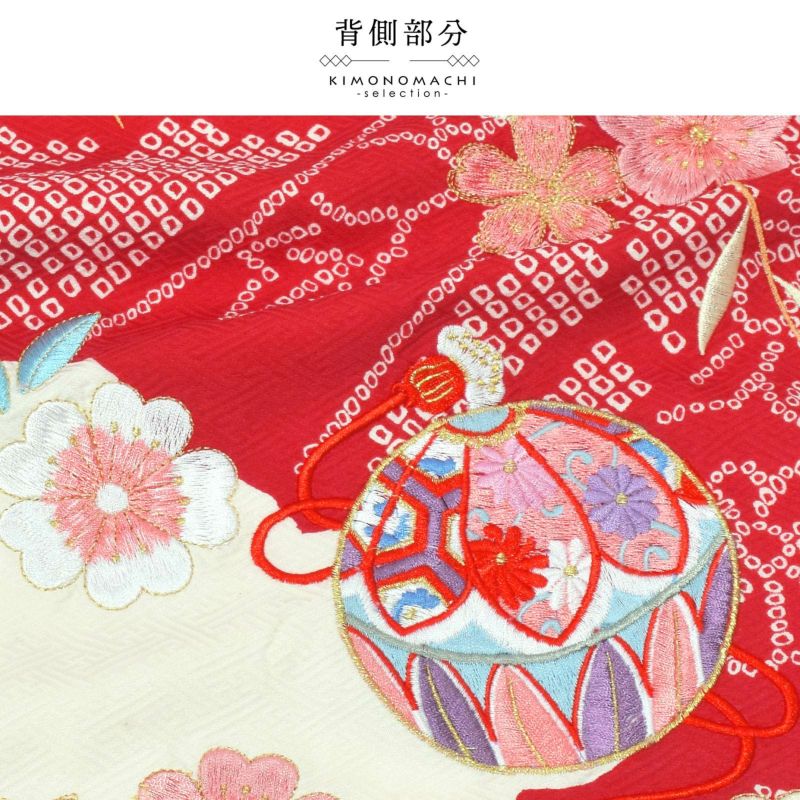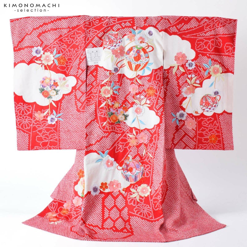 紗綾型の地紋のある赤紅色の地に、染めの疋田で表現された束ね熨斗、雲取り。その上に、刺繍で表現された手毬に枝垂桜、菊や梅の花の丸。金の輪郭や蕊にクリーム色、赤、桃色や水色、藤色などの配色。